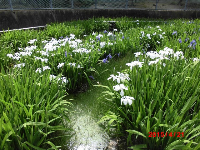 現在、一宮公園でカキツバタの青紫、白色の花が見頃を迎え、訪れる人の目を奪っています。