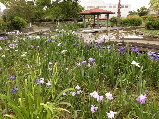 現在、徳島市の助任緑地(蜂須賀候墓所)では、約400株約1300本のひときわ華やかなハナショウブの花が5割程度、咲き誇っています。