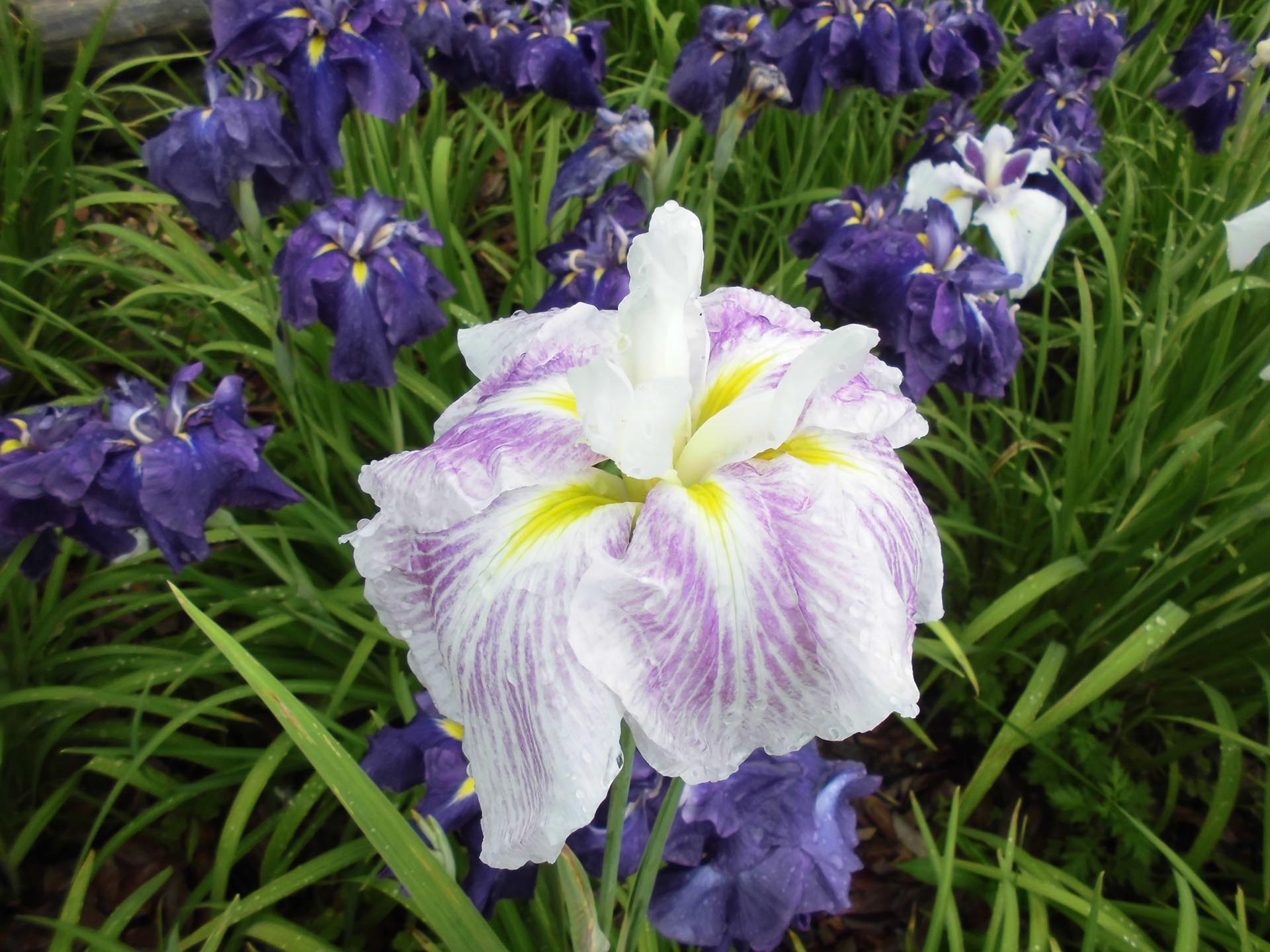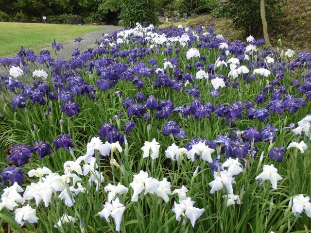入梅とともにぐずついたお天気が続きますが、徳島市の阿波史跡公園では、梅雨をしっとり彩るハナショウブの紫色、白色の花が、見頃を迎えています。
