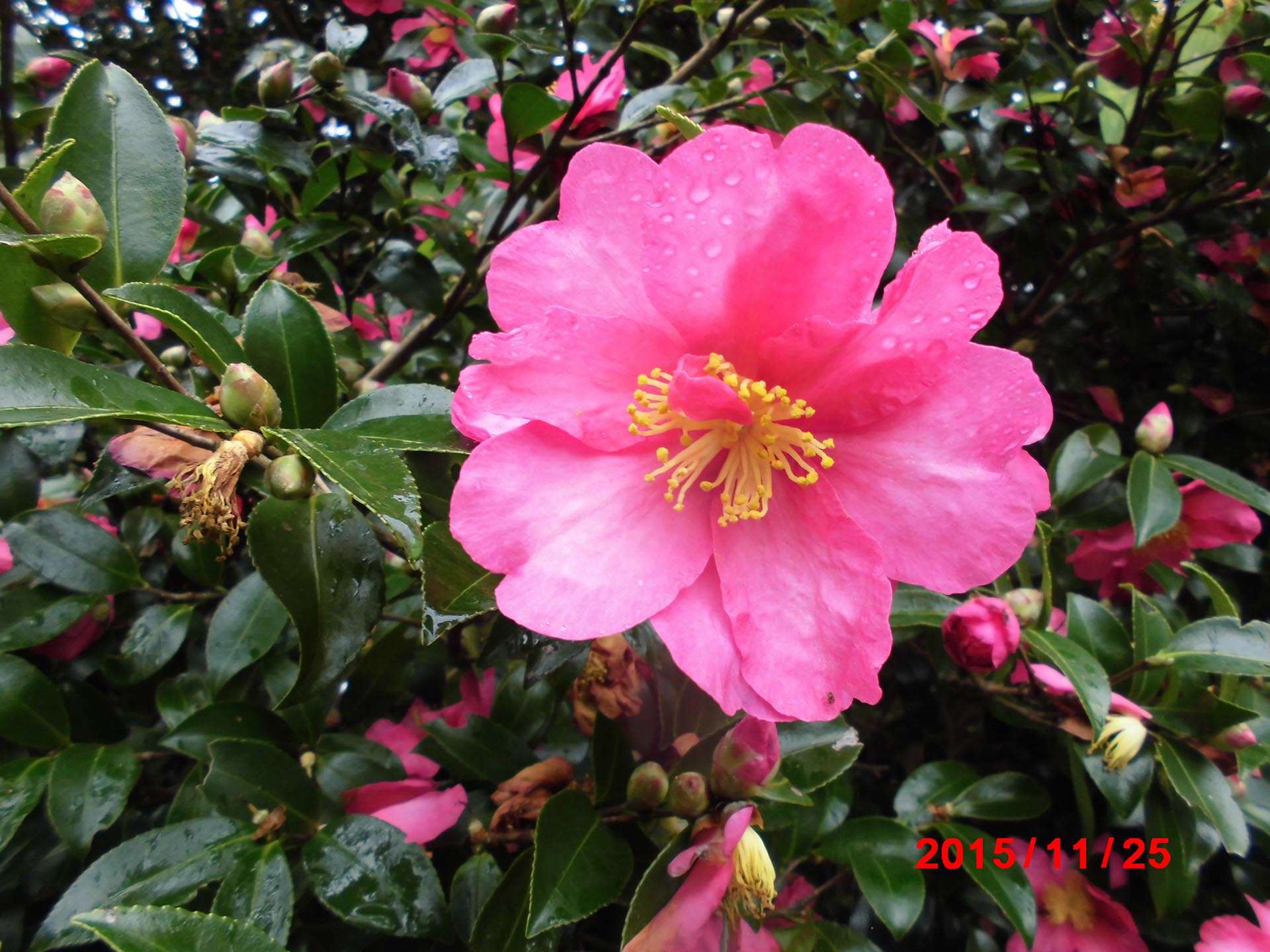 朝晩は寒さが身にしみる季節となりました。秋の終わりから冬の寒い期間にサザンカが、赤、ピンク、白色などの花を咲かせます。「サザンカ、サザンカ咲いた路 たき火だ たき火だ 落ち葉焚き」の日本の童謡「たき火」は小学校の音楽の教科書にも掲載されるぐらい、日本人には馴染みの深い花の一つです。サザンカとツバキの花の散り際を比べると、ツバキは花全体が落ちますが、サザンカは花弁一枚づつに分かれて散ります。