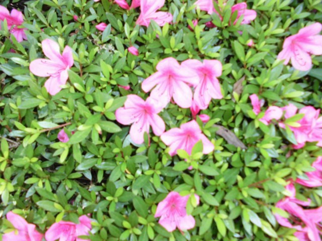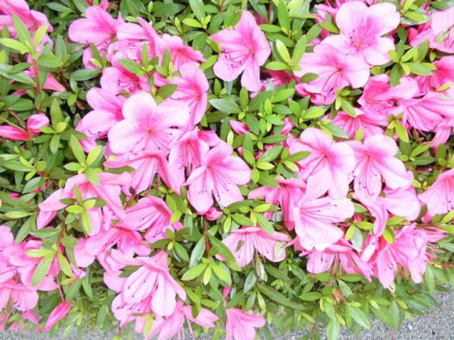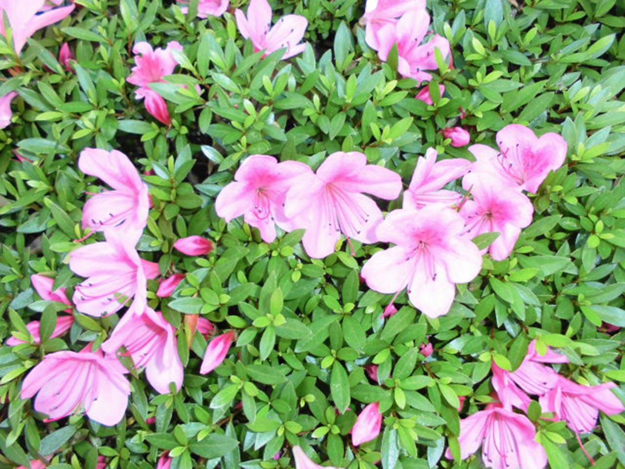 五月晴れに明るさを感じるここちよい季節となりました。5月中旬から、白、紅、淡紅、紫色といった優しい色合いで、かわいらしくサツキツツジの花が咲き始めています。他のツツジの花は4月中旬から開花するのに対し、サツキツツジの花は5月中旬から開花します。また、他のツツジは新葉が出る前に花が先に咲きますが、サツキツツジは先に新葉が出てきてから花が咲きます。