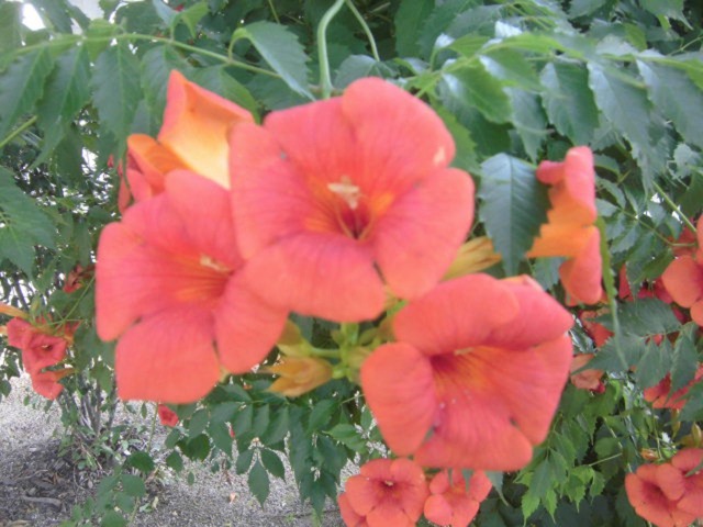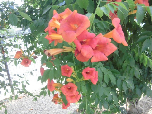 今年も梅雨の季節となり、橙色をしたノウゼンカズラの花が咲いています。ノウゼンカズラの花は、枝先に集まり垂れ下がって花を咲かせます。花の寿命は短くても、夏の暑い期間に絶え間なく美しい花を咲かせるので長く楽しめます。また、蔓草なので気根を出して樹木や壁などの他の物に付着して、蔓を伸ばさないと生きていけない、かよわい樹木です。