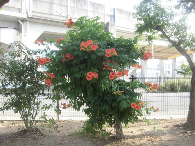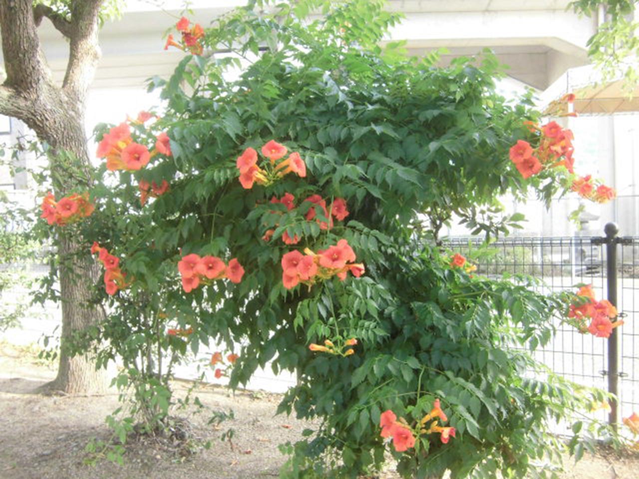 夏の期間、北佐古緑地ではノウゼンカズラのラッパ状の花を、楽しむことが出来ます。