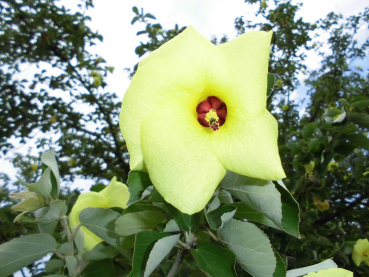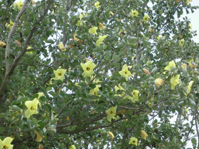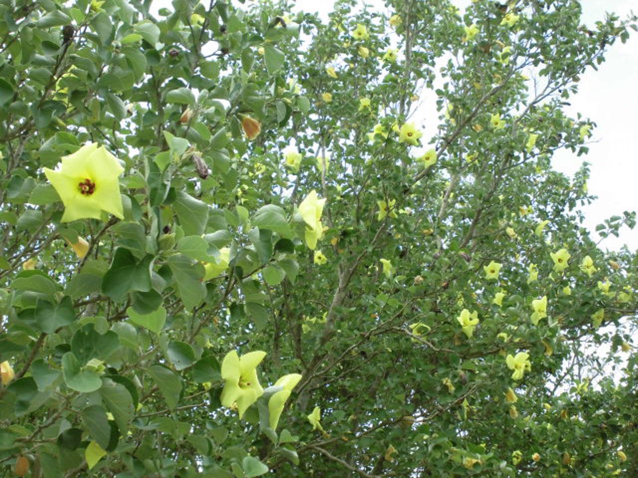 夏空の白い雲とよく似合う、ハマボウの黄色い花がさわやかに咲かせています。ハマボウは、海岸に自生する植物で木の全体に花芽をつけ、その大木から想像もつかない美しい黄色の花をつけ、意外性があります。また、ハマボウの花は、朝開いて夕方には咲き終わる一日花だが、株全体では次々と花をつけ夏の期間楽しむことが出来ます。