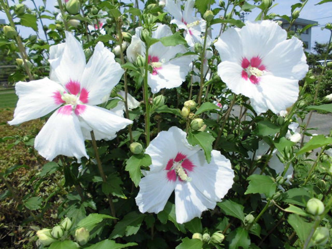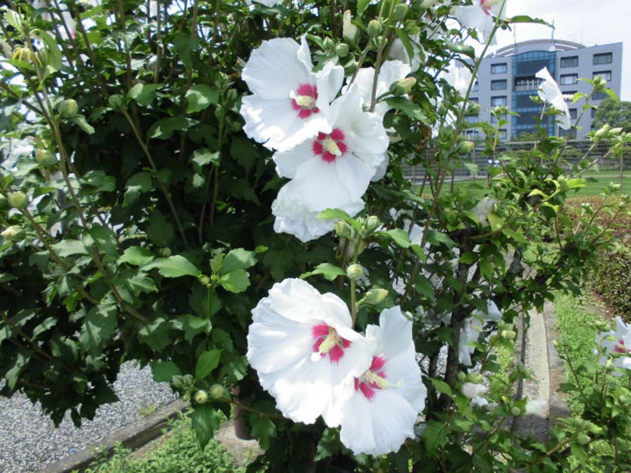 花火の音が聞こえる季節となり、ムクゲの花が咲き始めています。ムクゲの花は、短命で朝咲いたらその日の夕方にはしぼんでしまう一日花ですが、夏の間とだえることなく新しい花を次々と咲かせます。花の色は、白、濃紅、濃紫、青紫、ピンクなどがあります。