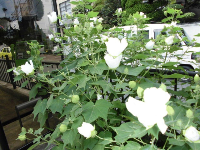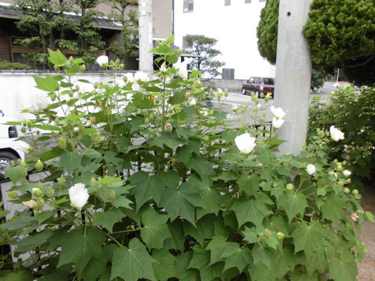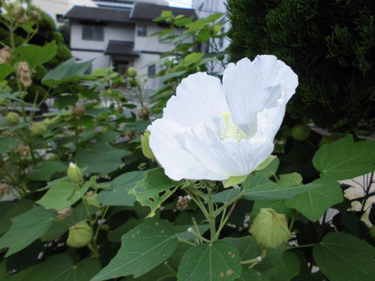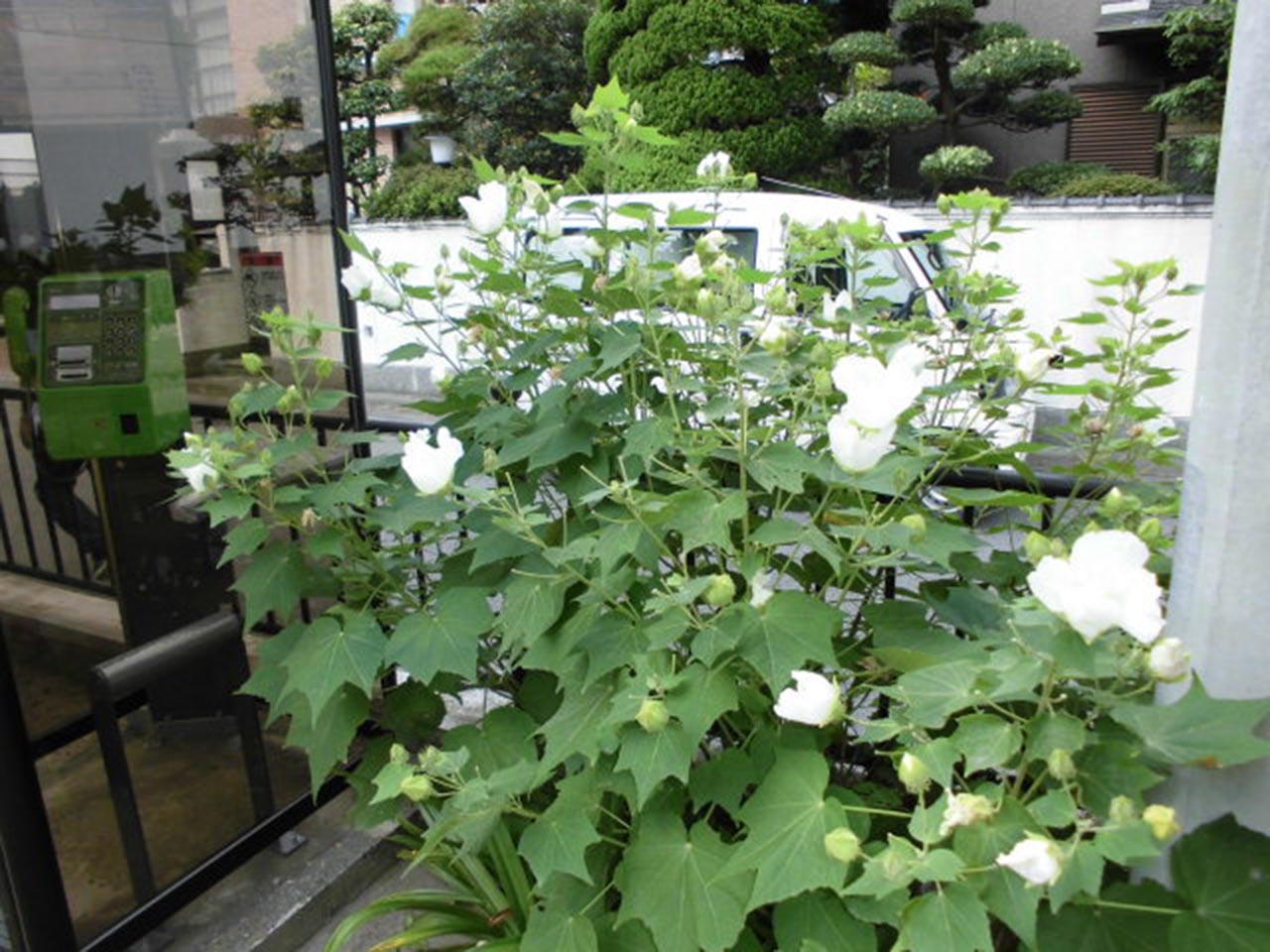 夕立を心待ちにしたくなるような猛暑の日が続く中、この暑さにも負けずフヨウの花が咲き始めています。フヨウの花は、7月〜9月下旬にかけて、直径10〜15センチ程度のピンク、白色の花をつけ、朝咲いて夕方にはしぼむ一日花で、長期間にわたって毎日次々と花を咲かせています。しとやかで優しい印象をあたえるフヨウの花は、昔から美しい女性のたとえにも用いられています。