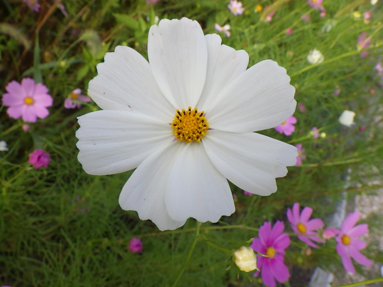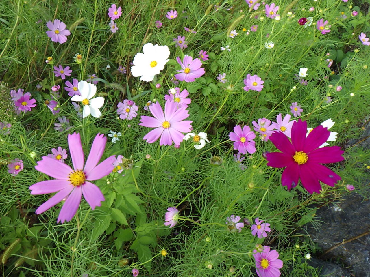 秋風が気持ちの良い季節になり、秋を代表する花であるコスモスが咲き始めています。花の色は、ピンク、白、赤、オレンジ、クリーム色など様々な色を楽しめます。コスモスは、夏前に種を蒔けば秋には咲き、非常に育てやすいため、色々な場所で植えられています。