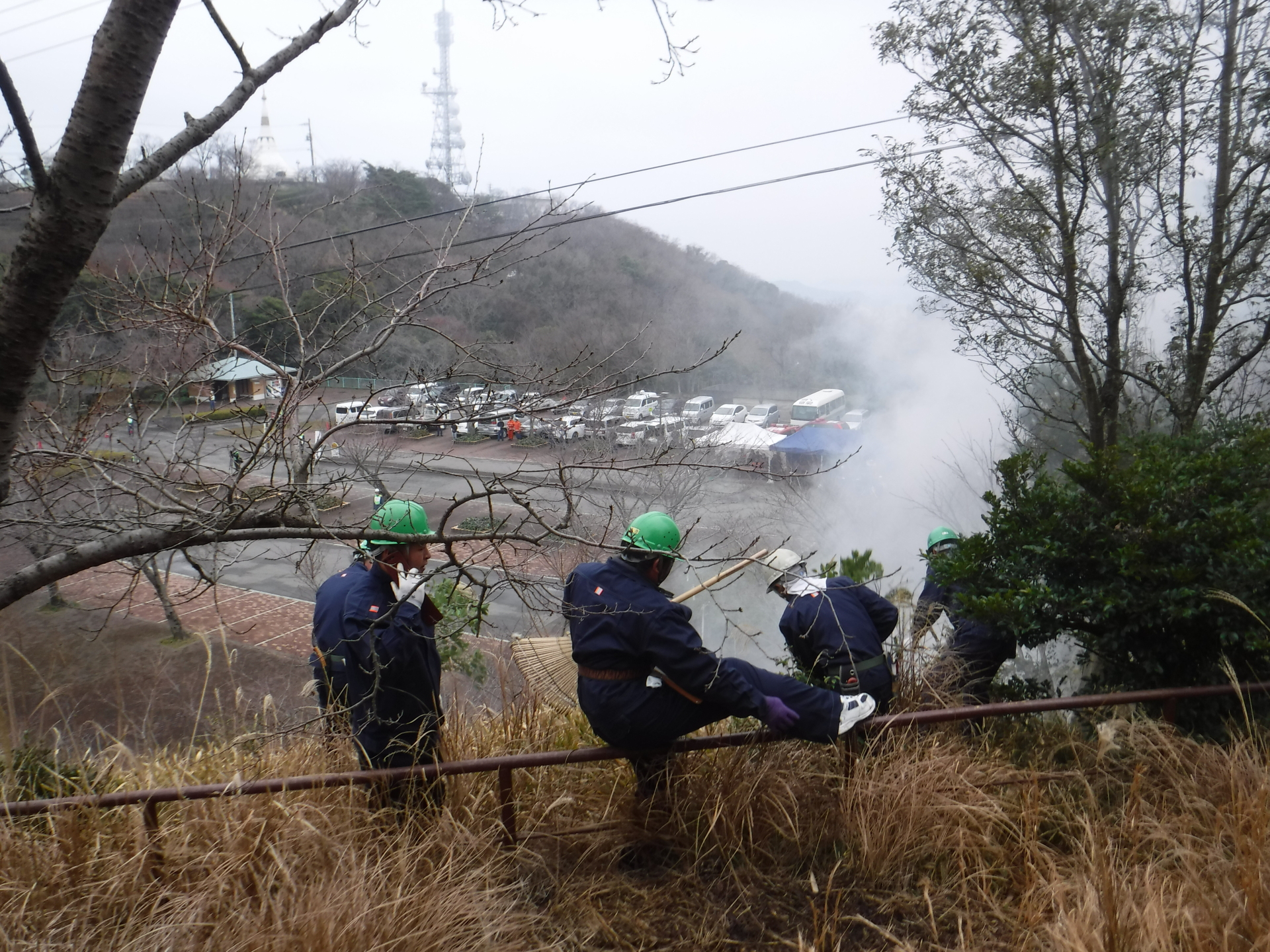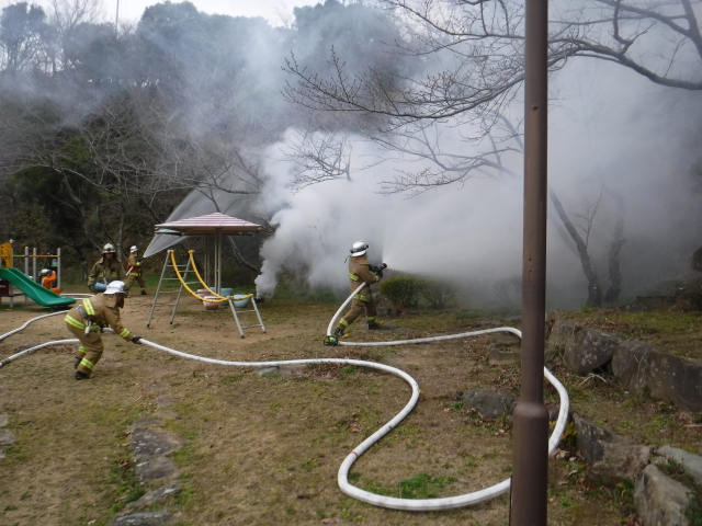 眉山公園林間駐車場付近で出火し、公社職員が発見、119番通報と公社への通報、初期消火及び避難誘導をしたが、延焼が拡大したという想定で消火訓練が行われました。