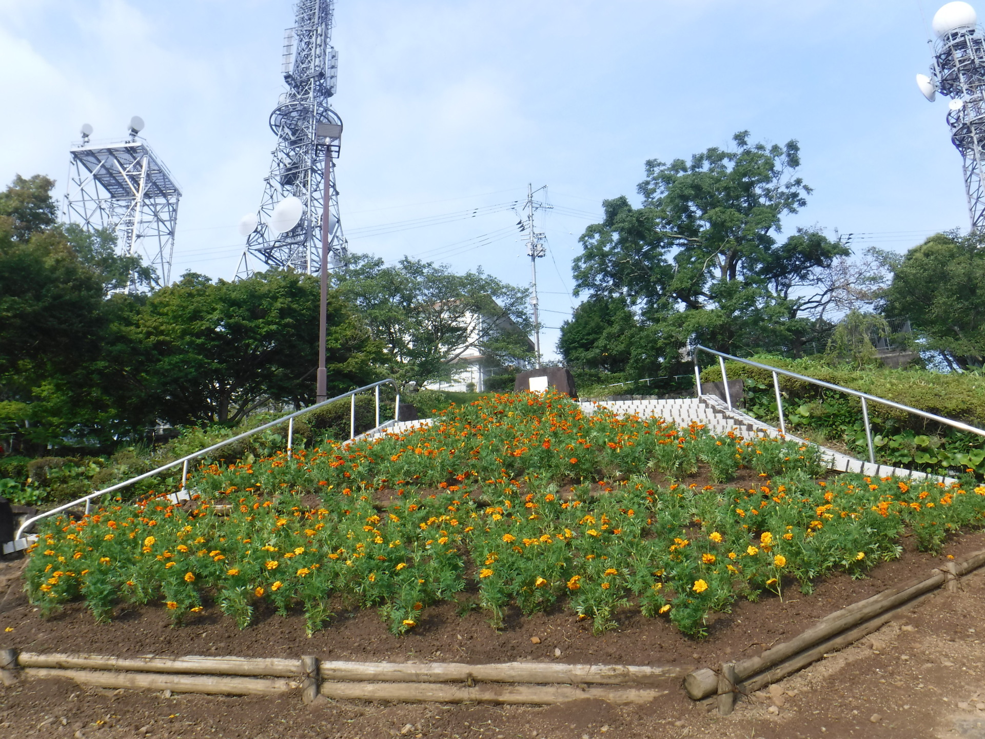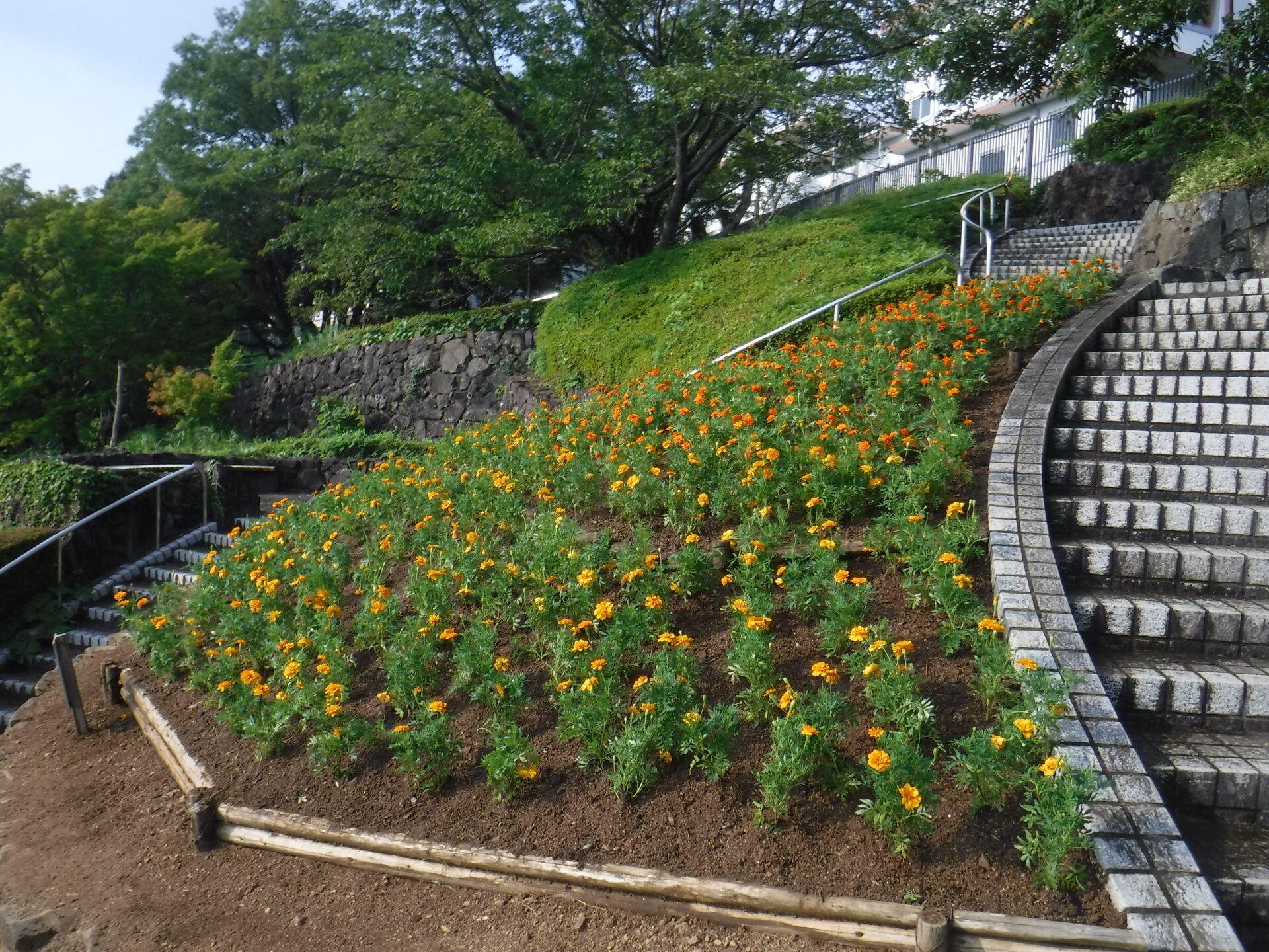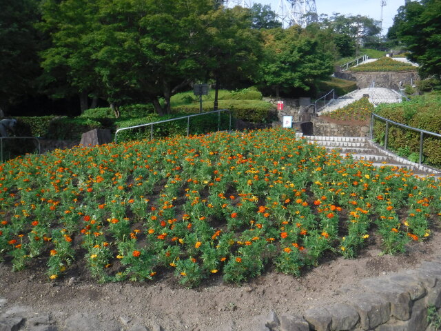 今夏も、徳島市の夏の風物詩として日本に誇る阿波おどりの季節が近付いて来ました。阿波おどりの開催に合わせ、たくさんの観光客に見て頂きたく、眉山公園の斜面花壇に花を植え替えました。花の種類は、マリーゴールドのオレンジ色と黄色合わせて1640本植栽しています。