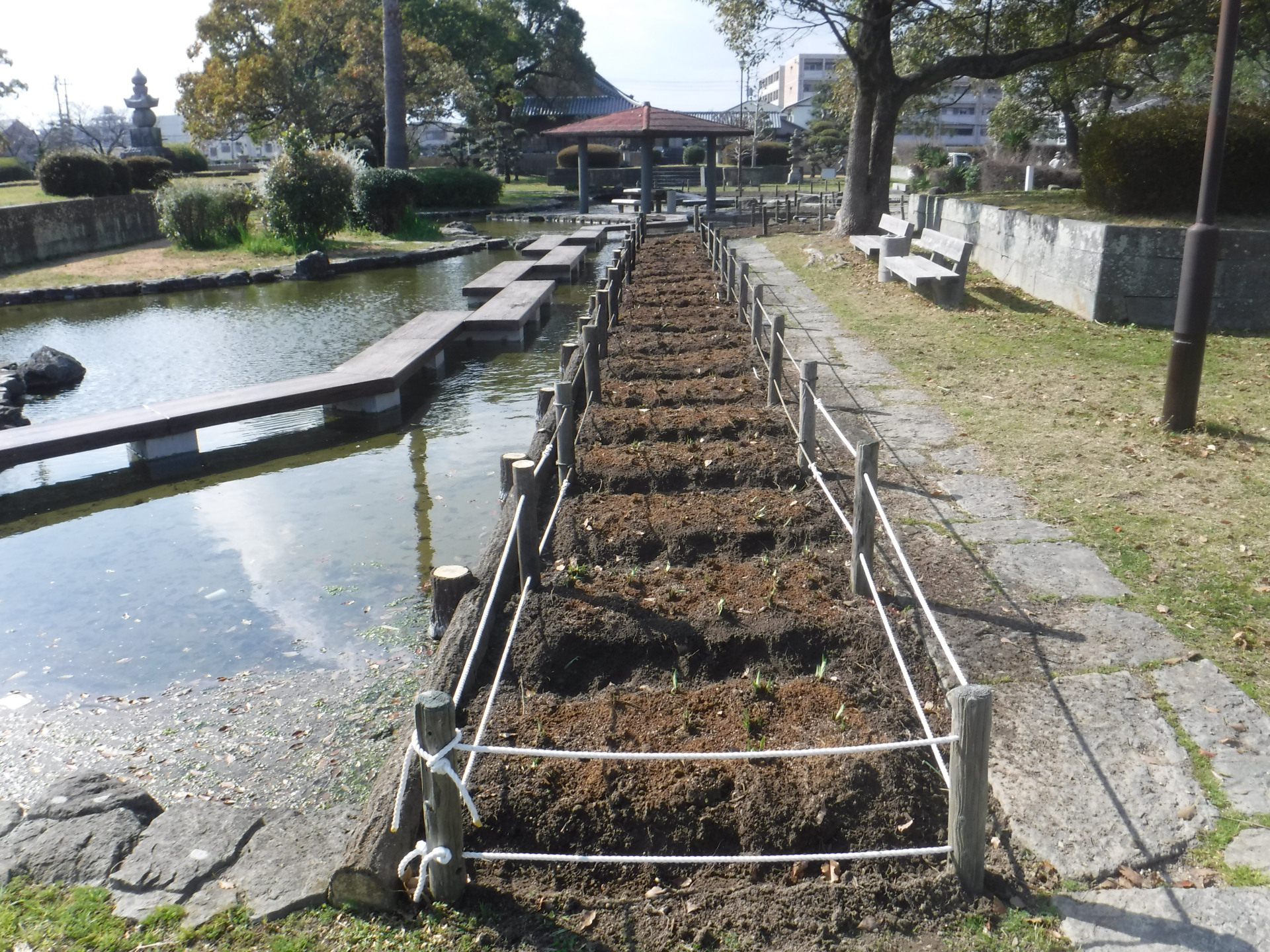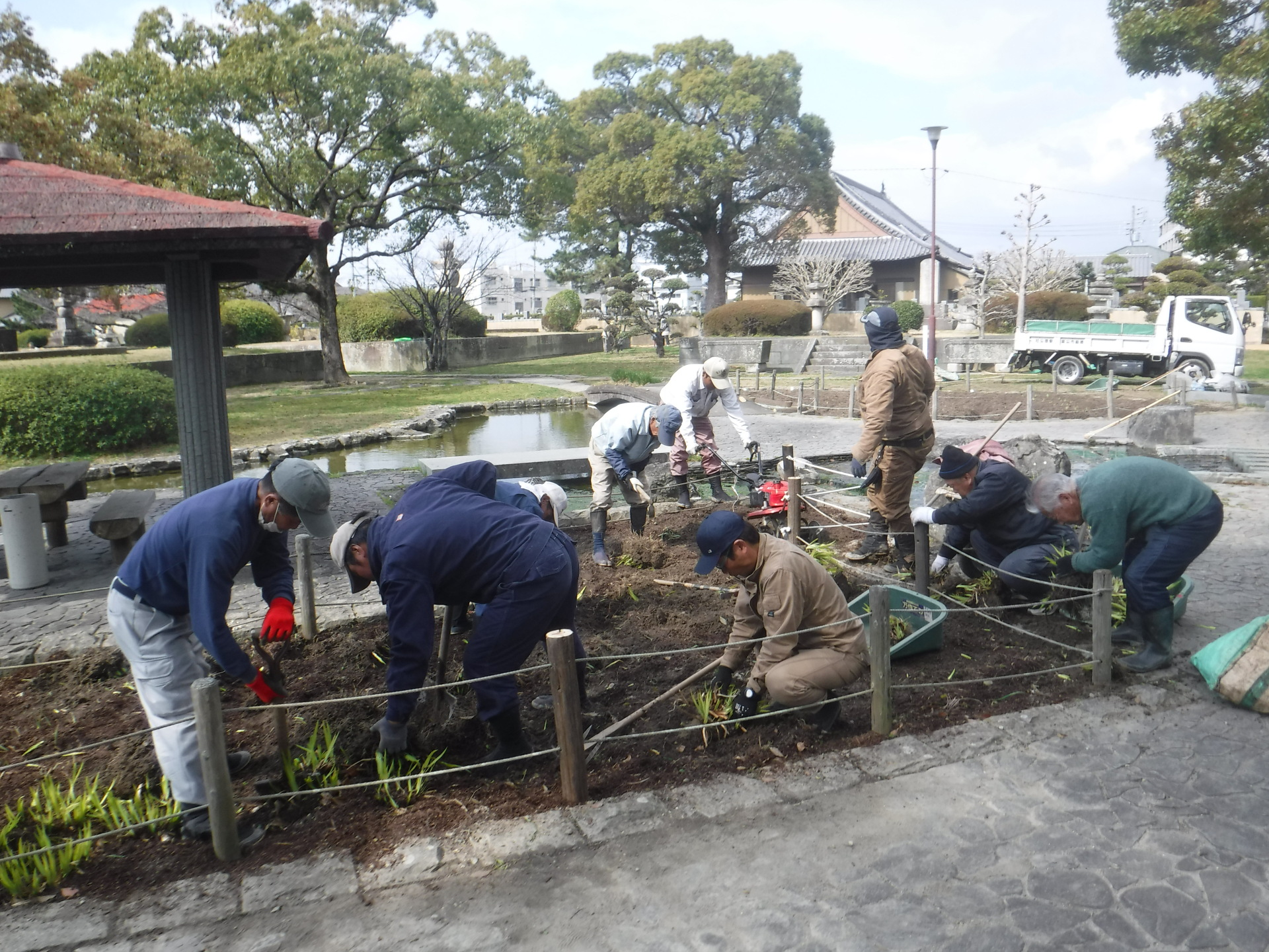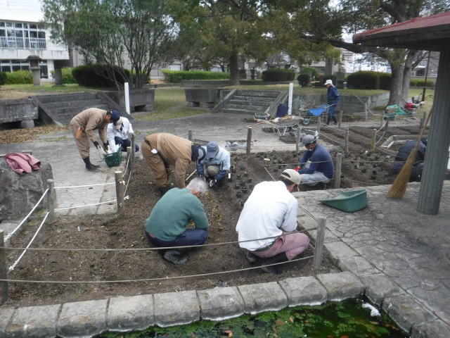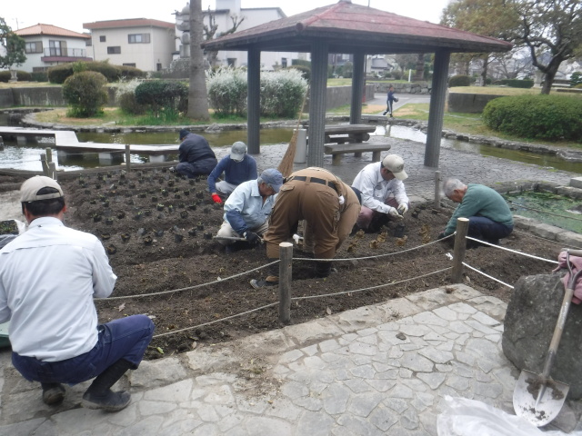 春の暖かい日差しが気持ちのいい季節となり、桜もようやくほころびはじめています。桜の便りが次々に聞かれるこの折、助任緑地におきまして「助任緑地を守る会」の西川会長さんと共に1000株のハナショウブを植えております。
