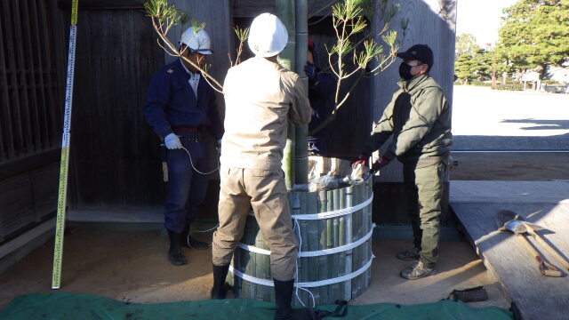 年の暮れを迎え、町を行きかう人々の足取りにもあわただしさが感じられるようになってまいりました。新型コロナウイルス感染症が沈静化の兆しを見せているものの、終息には中々たどり着きませんが2023年の新しい年を迎えるにあたって、公社職員一同で丹精を込めて徳島中央公園の鷲の門前と徳島城博物館前に門松を設けています。
