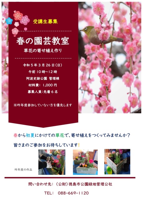 HOME お知らせ 春の園芸教室受講生募集のお知らせ 春の園芸教室受講生募集のお知らせ 2023/03/08 春から初夏にかけての草花で、寄せ植えをつくってみませんか?皆さまのご参加をお待ちしています。 BACK HOME