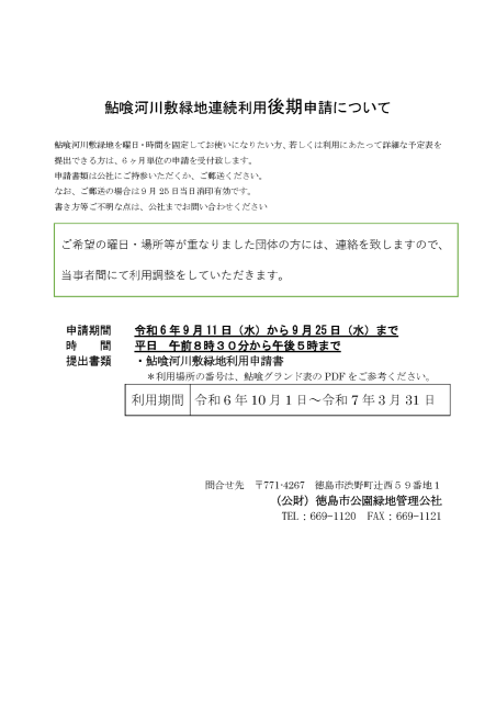 HOME お知らせ 鮎喰河川敷緑地連続利用申請(後期)について 鮎喰河川敷緑地連続利用申請(後期)について 2024/09/11 鮎喰河川敷利用申請の後期分の受付を開始致します。後期利用期間:令和6年10月1日から令和7年3月31日申請期間:令和6年9月11日(水)から令和6年9月25日(水)まで BACK HOME