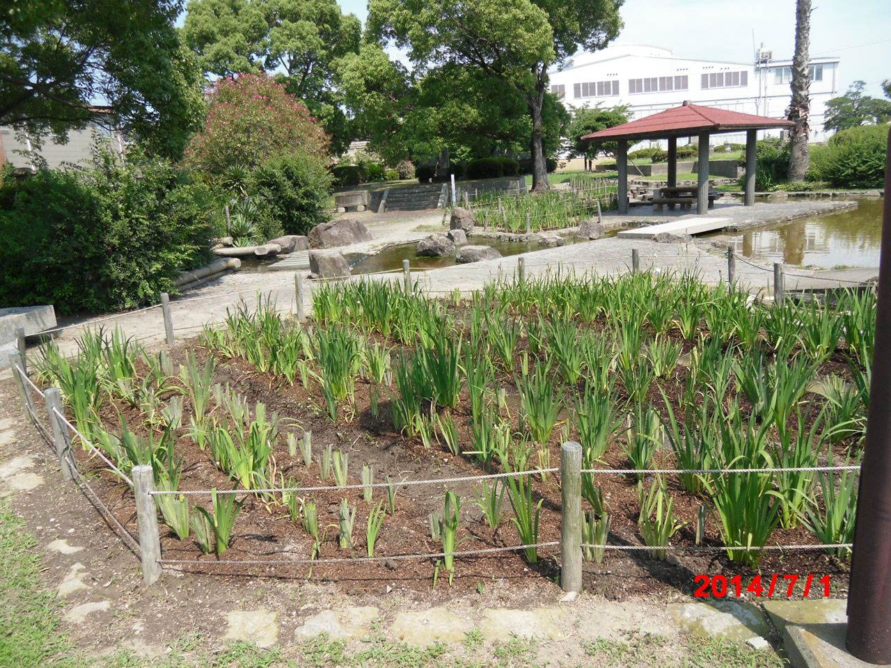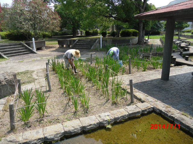 ハナショウブは6月に花を咲かせるため、従来は9月に株分け植え替えをしていましたが、今回、助任緑地において多くの花が咲くよう期待を込めて、花が終わるのと同時に株分け植え替えをしました。「助任緑地を守る会」の西川会長さんと共に多種類の色のハナショウブを植えております。