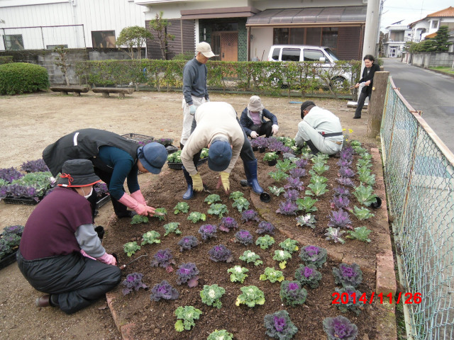 秋の色もようやく深みを増しています。11月26日(水)、庄町南公園において地元の皆様と協働で花壇に、ハボタン紅白合わせて170ポットの花を植えました。2015年の新しい年を迎えるに際し、ハボタンが大きく育つことを期待し、花と花の間隔を十分取って植えております。