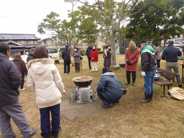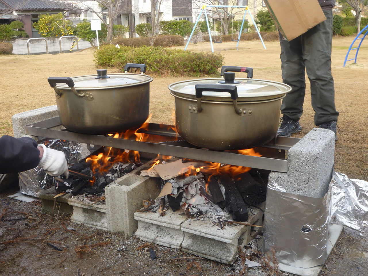 さる2月1日、丈六南公園において防災訓練が実施されました。参加者は約100人にのぼり、本番に即した有意義な訓練となりました。今回の防災訓練では、当公社が寄贈したかまどベンチを利用した、豚汁の調理が実際に行われました。