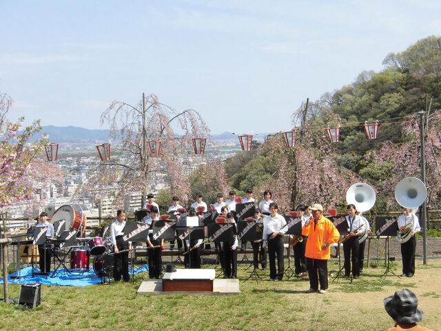 桜の花もらんまんとなり、華やかな季節となりました。「日本のサクラ名所百選」に選ばれている西部公園で4月4日(土)10時30分より、約550本のサクラの下で、加茂名中学校吹奏楽部による「第六回らんまんコンサート」が開催されました。春風で桜吹雪が舞っているなか、吹奏楽部部員20名余りの、素晴らしい演奏に約200人が酔いしれました。