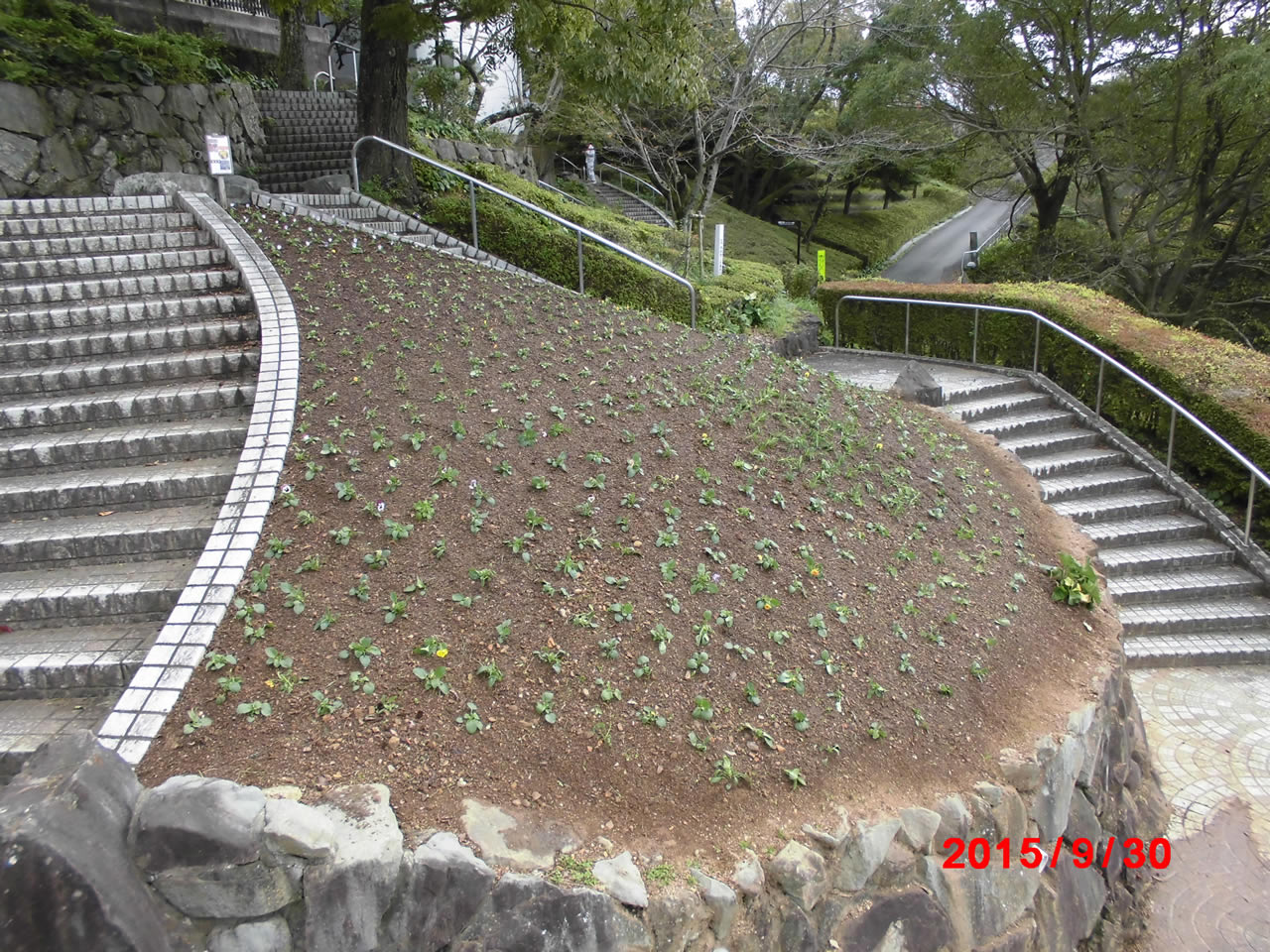 マチアソビ「クライマックスラン」に合わせ、眉山公園の斜面花壇にこれから見頃の花ばかり、新たに700ポット(パンジー、ビオラ、なでしこ)植えております。