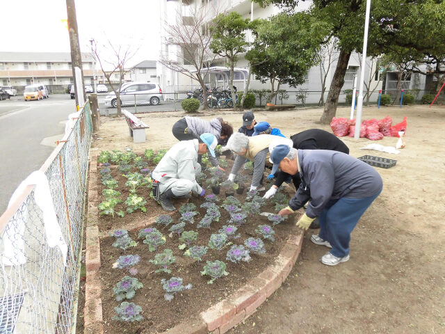 朝、夕冷え込む季節になりました。2016年の新しい年を迎えるに際し、11月25日(水)庄町南公園において地元の皆様と協働で、花壇にハボタン紅白合わせて180ポットの花を植えました。ハボタンはまだ少し小さめですが、大きく成長することを願い、地元の皆様に見て頂けるように期待しています。