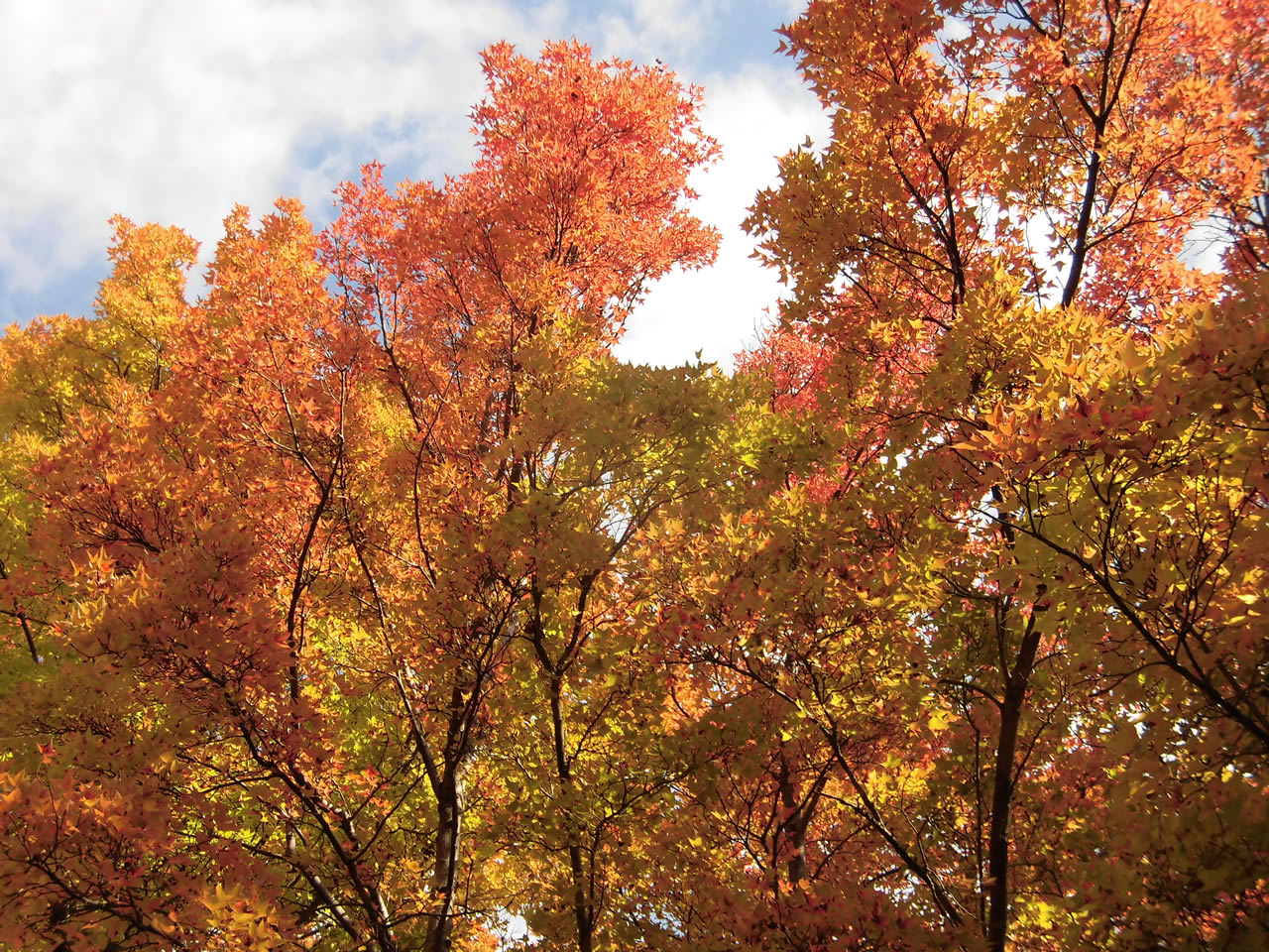 落ち葉が風に舞う季節となりました。春に新しい葉を生じていた落葉樹が、秋の低温期になると黄色から赤色に変化し、葉を落としています。紅葉を美しくいろどる代表的な樹木であるタイワンフウが紅葉時期を迎えました。枯れ葉が舞い、葉を落とした地面には落ち葉でいっぱいになり、紅いジュータンが敷き詰められているようにも見えます。