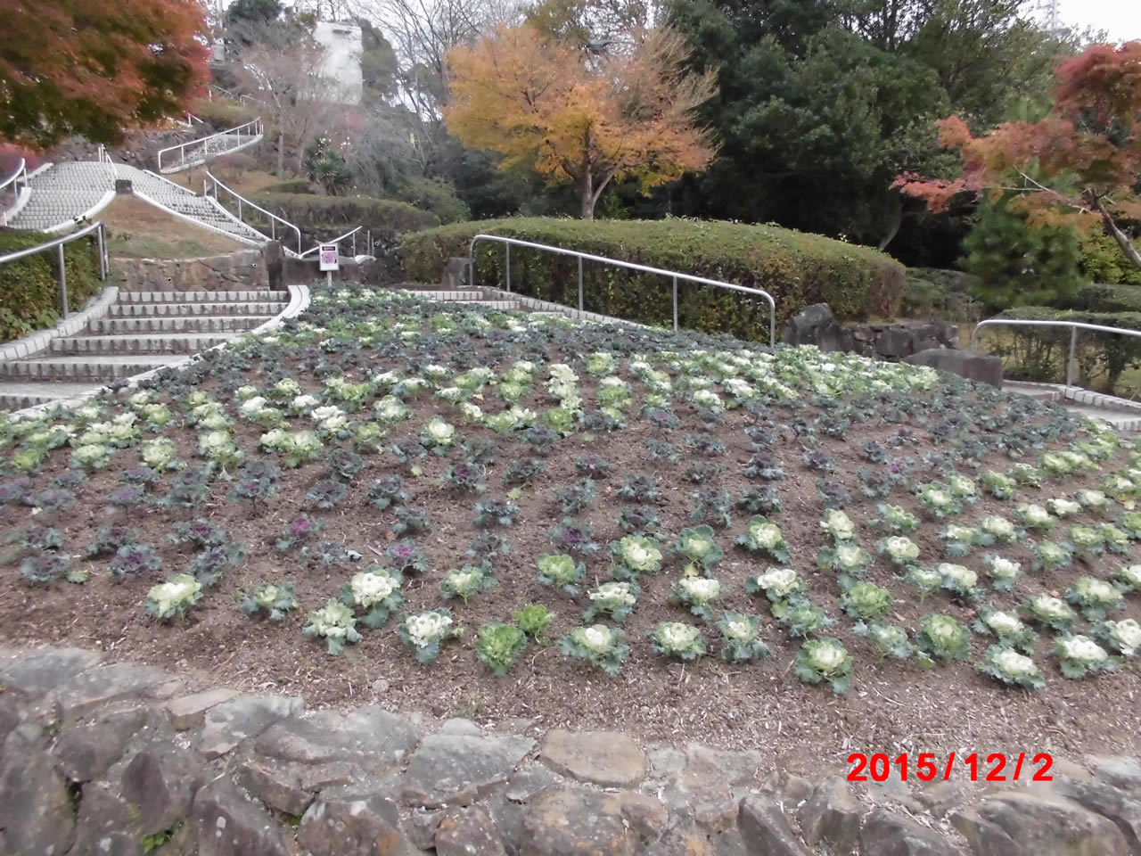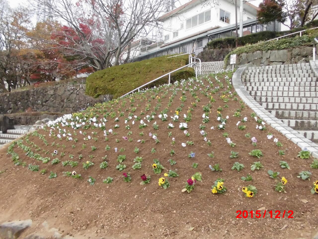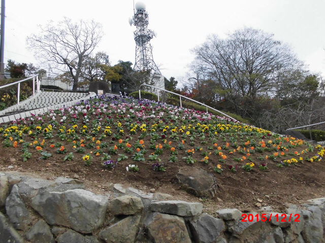クリスマスのイルミネーションが目を楽しませてくれる季節となりました。2016年の新しい年を迎えるに際し、たくさんの方々に、眉山公園で新しい花を見ていただけるよう、花を植え替えました。林間駐車場から山頂に至る花壇(花のカスケード)にハボタン720ポット、ビオラ290ポット、パンジー1050ポットの花を、また西側あずまや(ガゼボ)の花壇にはハボタン90ポットの花、合わせて2150ポット植えております。
