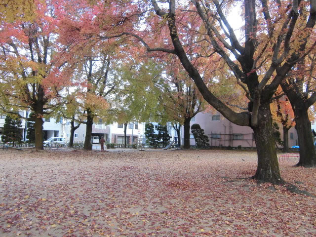 さて、徳島市役所西側の幸町公園では、タイワンフウの葉っぱが黄色から赤色に変化し、また紅葉の役目を終えた枯れ葉が舞い落ち、地面を赤褐色に染めています。