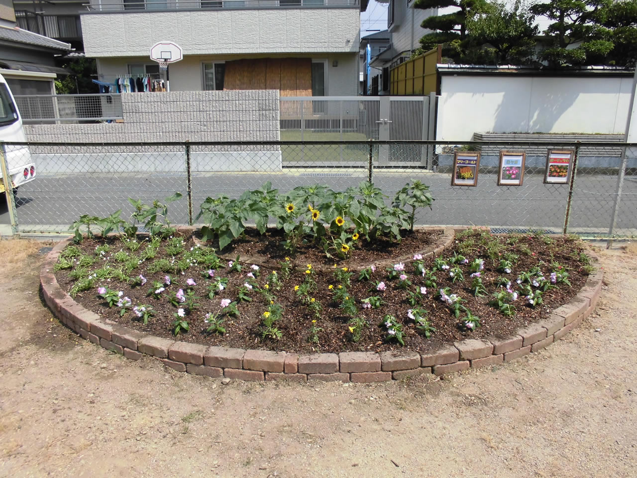 ひまわりが毎日のようにぐんぐんと背を伸ばすこの頃、7月27日(水)庄町南公園内の花壇において、地元の皆様と協働で夏の花に植え替えました。植え替えた花は、サルビア30ポット、マリーゴールド60ポット、トレニア60ポットで、暑さに強い花に植え替えしました。