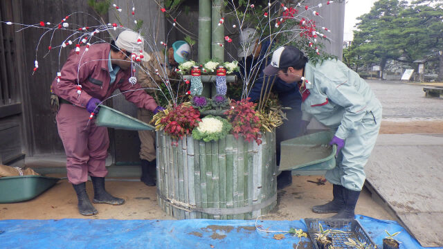 2016年も残すところあとわずかとなりました。年末年始の準備で何かとお忙しいことと思います。2017年の新しい年を迎えるにあたって、徳島中央公園の鷲の門と徳島城博物館の正門に門松を設けています。新しい年は、徳島が活気づき話題性のある徳島になることを思い、公社職員一同で丹精を込めて門松を作成しました。