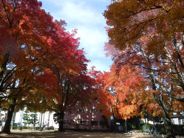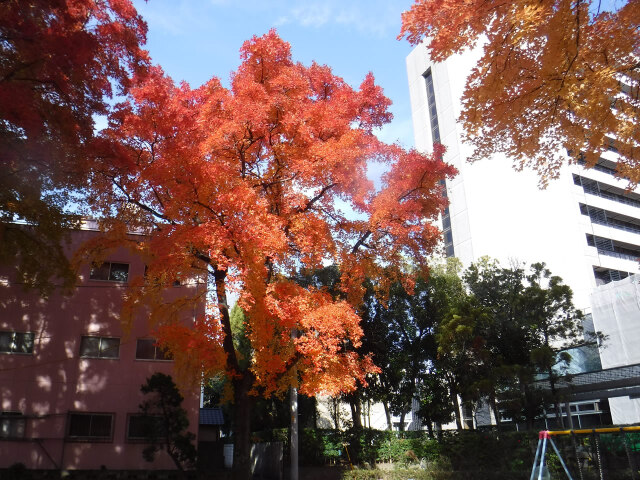 クリスマスイルミネーションが目を楽しませてくれる季節となりました。秋の紅葉で代表的なタイワンフウの葉が美しく彩っています。タイワンフウは、主幹が立ち円錐形に伸びる樹形で紅葉が特に美しく、黄色から紅色になり樹皮は灰褐色で滑らかで落葉後の端整な枝ぶりにも風情があります。徳島市役所西側の幸町公園でも、タイワンフウの葉っぱが黄色から赤色に変化し鮮やかに紅葉しています。