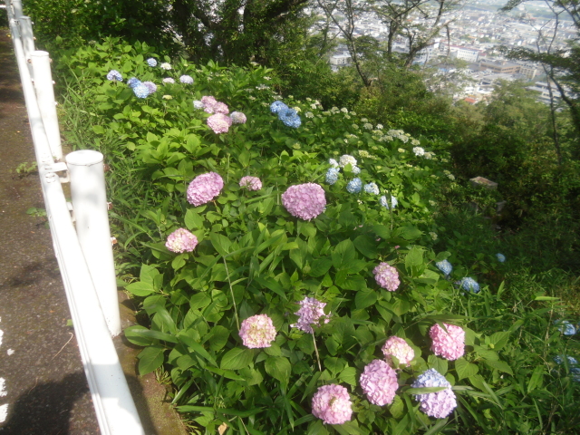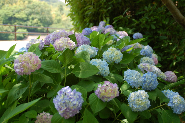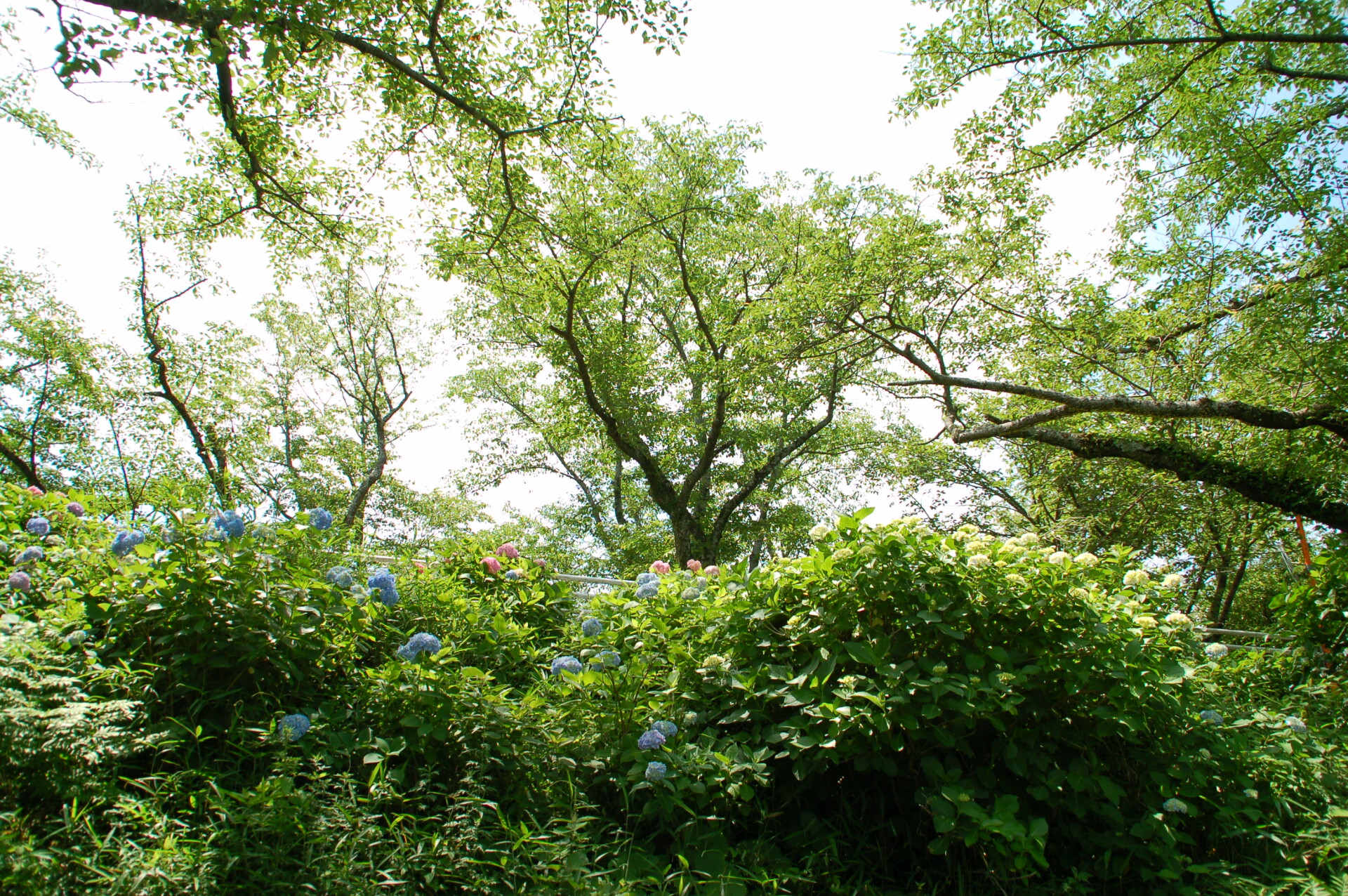 早くも夏を思わせるような日差しの強さに驚かされています。梅雨の時期に色彩豊かなアジサイの花が群落をなし、手まりのような花姿にかわいさを漂わせています。アジサイの花の咲き始めは薄緑色、それがやがて白色になり徐々に青紫や赤紫に色づき、咲き始めから花の終わりまでに色の変化する様子が見られるので「七変化」とも言われています。