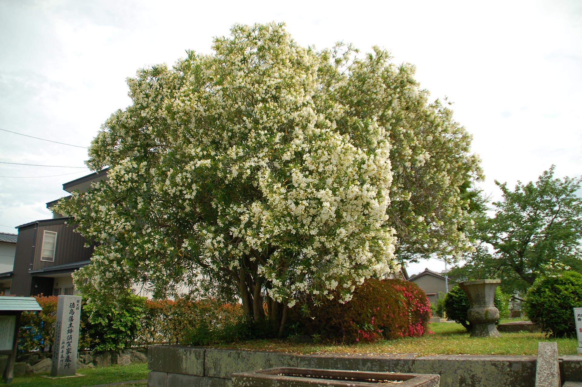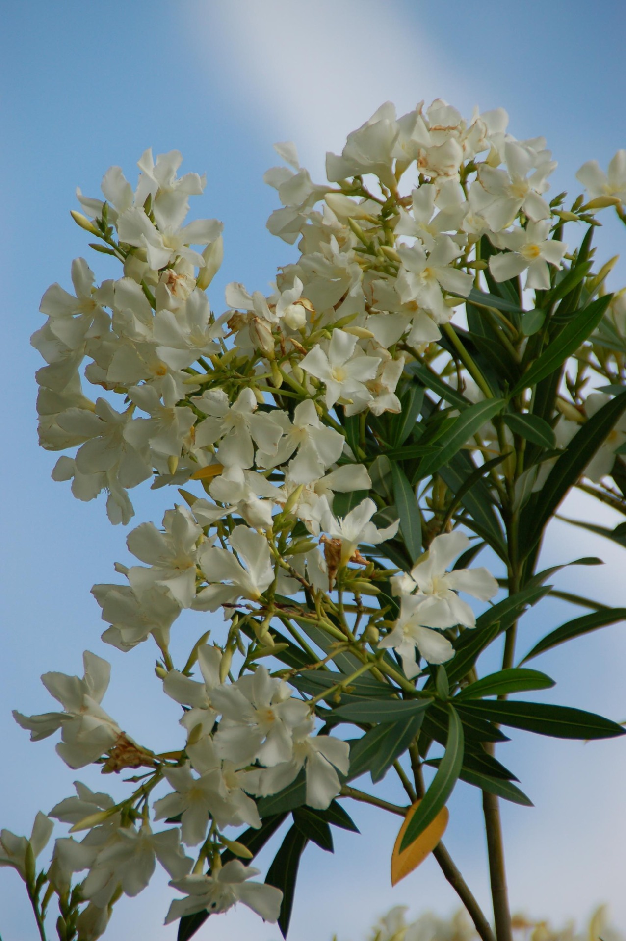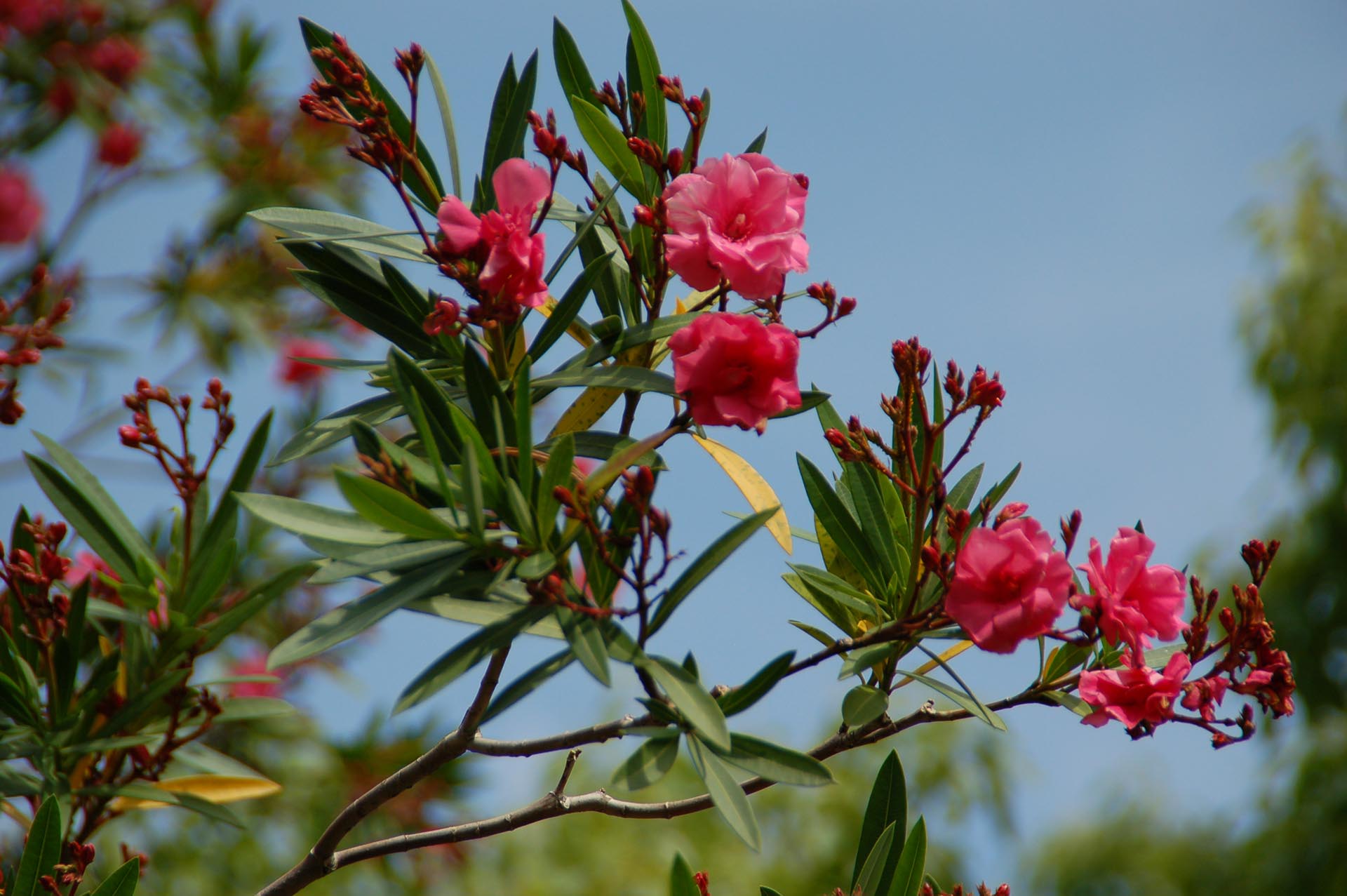 あじさいの花が少しずつ色づき始め梅雨の気配を感じる季節となり、キョウチクトウの枝の先に群がっているつぼみが咲き始めています。キョウチクトウの花は、6月〜9月までモモの花に似た白、赤、ピンク、黄色等の花を咲かせます。キョウチクトウは、乾燥や大気汚染に強いため街路樹や公園等によく植えられています。広島市では、原爆が落ちた後いち早く花を咲かせた植物がキョウチクトウだったことから、復興のシンボルとされ広島市の花に制定されています。