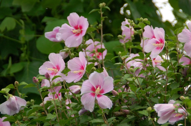 色とりどりの七夕飾りに夏の訪れを感じる季節となり、ムクゲの花が咲き始めています。ムクゲの花は、夏から秋にかけて白、ピンク、紅紫等の美しい花を咲かせます。明るくなる前から咲き始め夕方には散ってしまう一日花と言われ、花は一日でしぼんでしまいますが次々に咲き続けます。