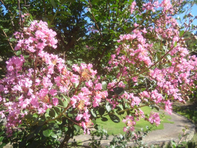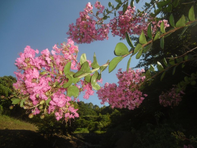 梅雨明けの暑さはまたひとしおに感じられていますが、サルスベリの花が鮮やかに咲いています。サルスベリの花は、白、ピンク、紅、紅紫等の花を咲かせ夏の盛りに百日近く咲き続けることから、まさに夏の花という感じがします。また、日当たりが悪いと花つきが悪くなり、日陰で育てるとほとんど花が咲かないので日当たりのよい場所で育てましょう。