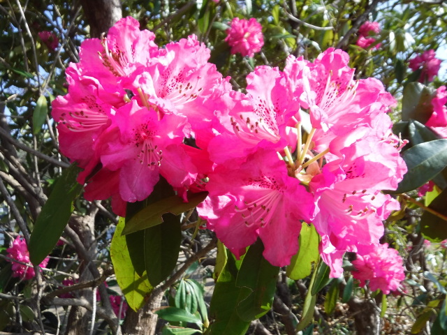 桜の季節もいつしか過ぎてすっかり葉桜の季節となり、直射日光の当たらない半日陰でセイヨウシャクナゲの花が咲き誇っています。セイヨウシャクナゲは、自生しているニホンシャクナゲに比べると花が大きく花色もカラフルで、赤、白、黄色、ピンクなどの見事な花を咲かせます。