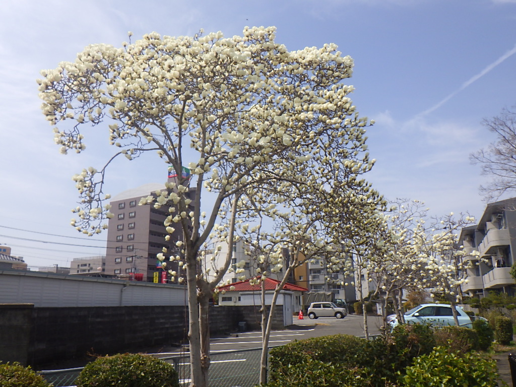 春寒も緩みはじめようやく過ごしやすい気候となり、ハクモクレンがいっぱい花を咲かせています。ハクモクレンの開花した花は、3~4日ほど楽しめ暗くなると閉じる習性があります。また、つぼみが必ず北を向いていることから、「コンパスフラワー」とも呼ばれています。