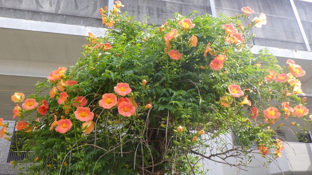 雨に濡れた青葉がいっそう鮮やかな色を見せるころとなり、暑い盛りにひときわ目を引くノウゼンカズラがオレンジ色の花を咲かせています。ノウゼンカズラの花は、ラッパのような形状で枝の先に大きな花をどんどん咲かせていく姿は迫力満点です。