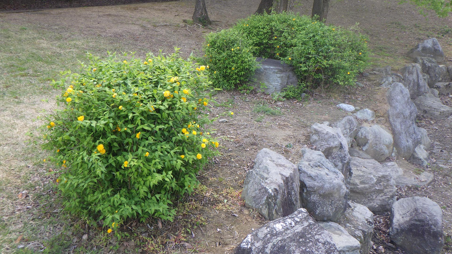 真新しいランドセルの一年生がまぶしく見える今日この頃、樹木の足元でヤマブキが深みのある黄色い花を美しく咲かせています。ヤマブキの花は、しなやかな枝に花をたくさん付けて風に揺らす姿はとても風情があります。
