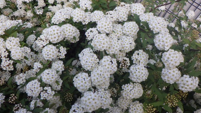 若葉の緑がまぶしい季節となり、コデマリが小さな白い花を咲かせています。コデマリの花は、細い枝や葉が見えなくなるほど白い多数の花を咲かせ、枝垂れる姿がとても見事です。