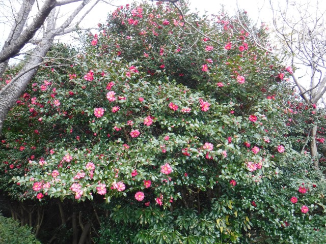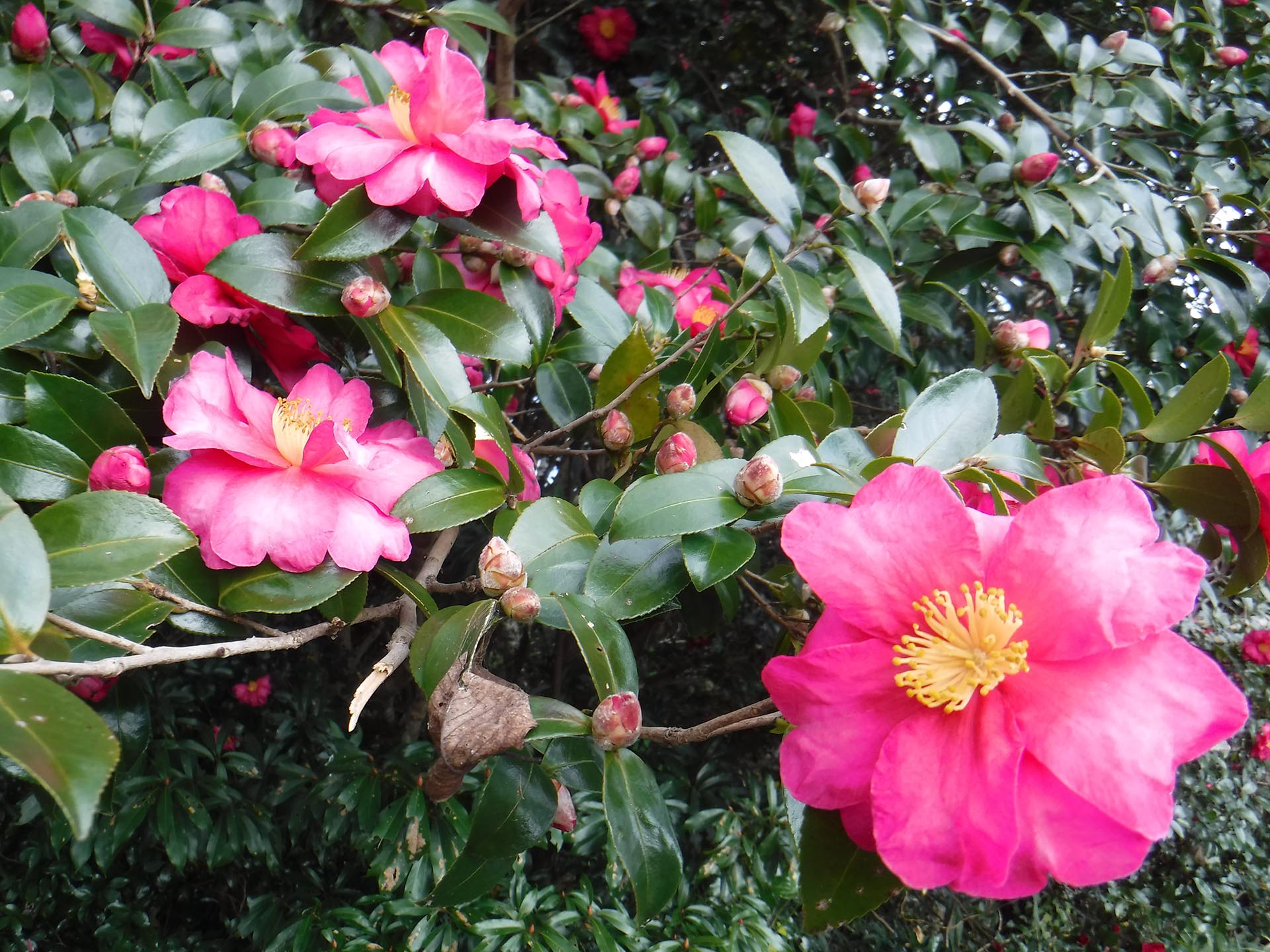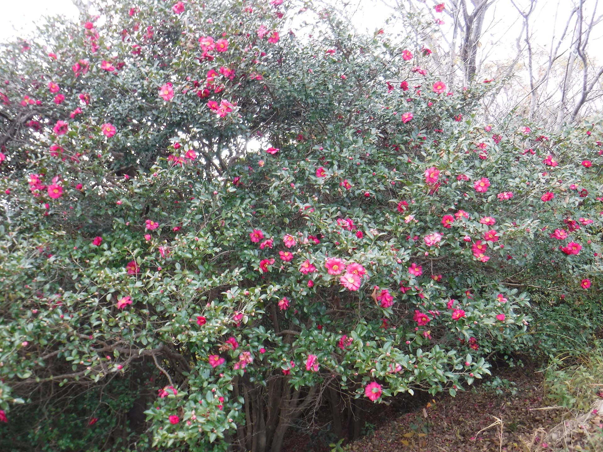 冬空の下、サザンカの花が美しい季節となり、花の少ない冬に開花するサザンカは、赤、ピンク、白色などの花を咲かせます。サザンカには、300以上の園芸品種があり、晩秋〜冬に咲く花を観賞するため、庭木や鉢植えに使われることも多く、古くから人気の高い樹木です。