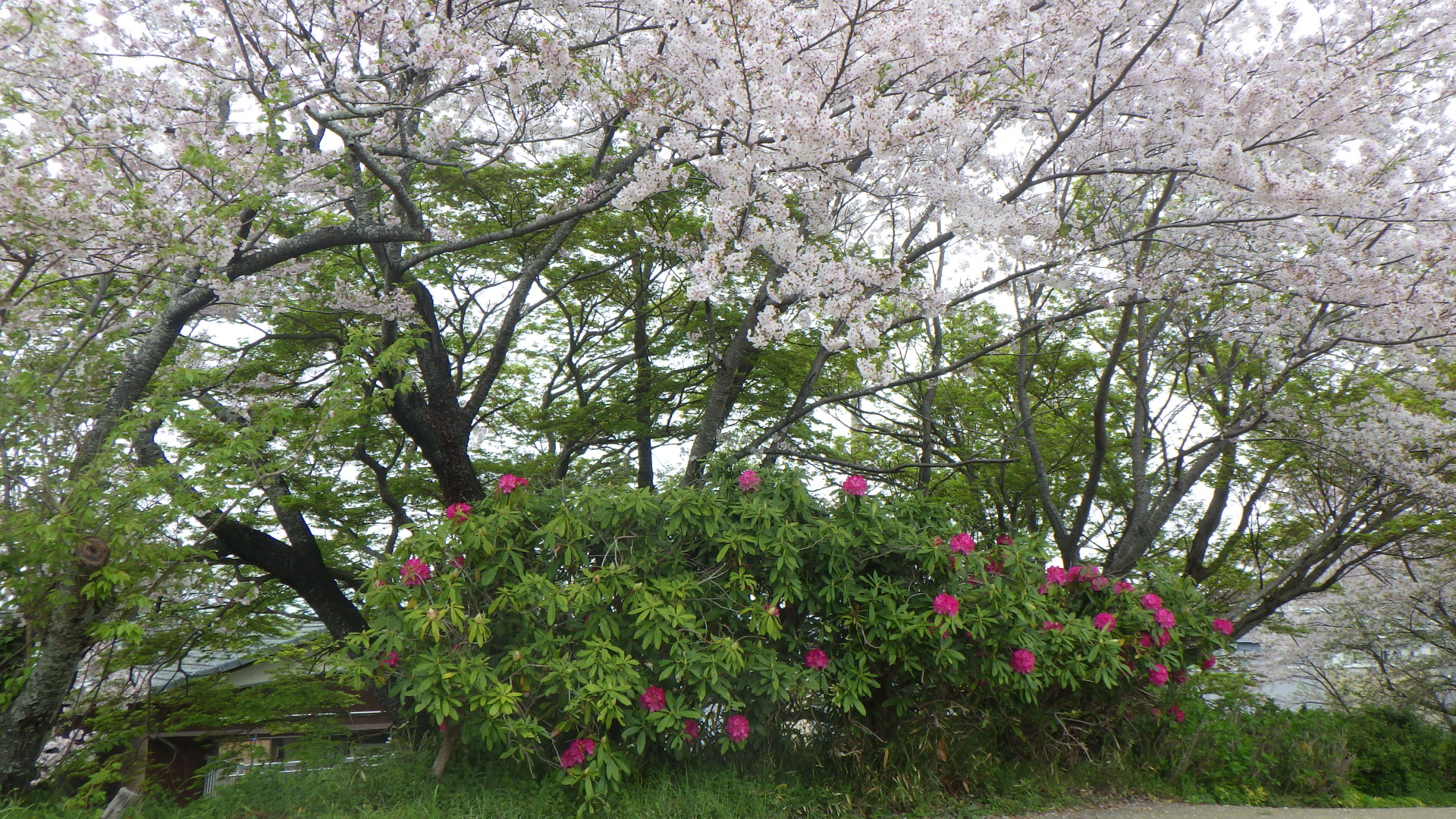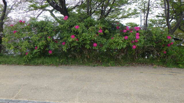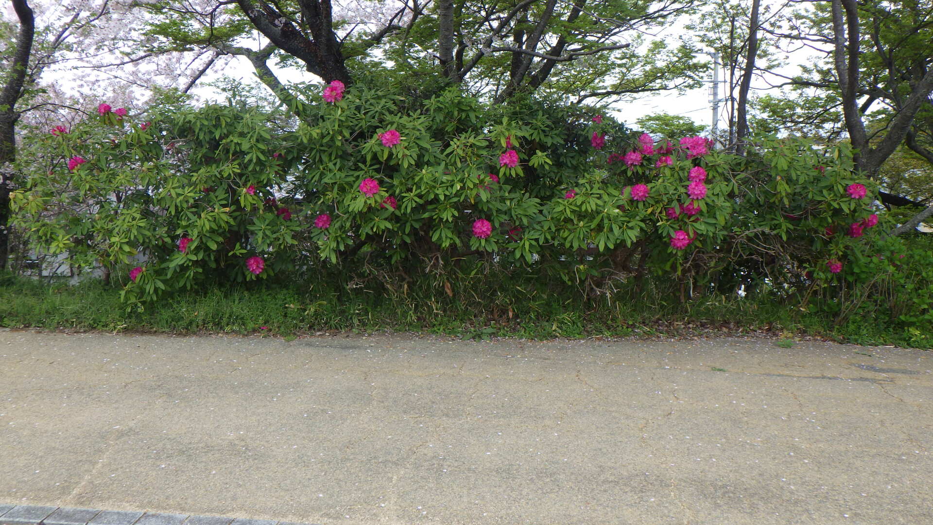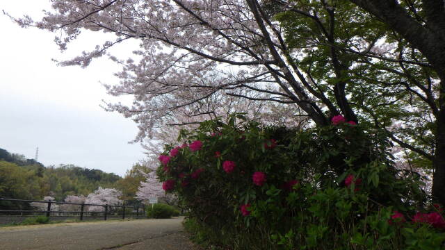 桜花らんまんの好季節、地蔵院池緑地でセイヨウシャクナゲの花が見頃を迎えています。