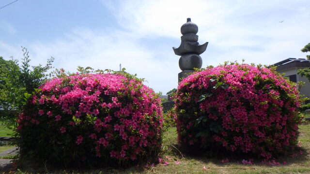 若々しい青葉が眩しい季節となり、サツキツツジの花が咲いています。サツキツツジの花は、肉厚で花びらが小さく一つのつぼみから2〜3つほどの光沢のある花を咲かせます。