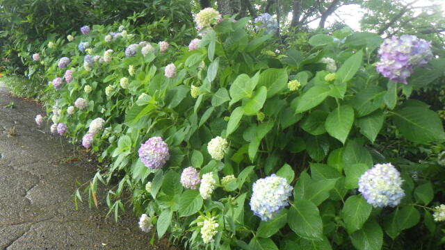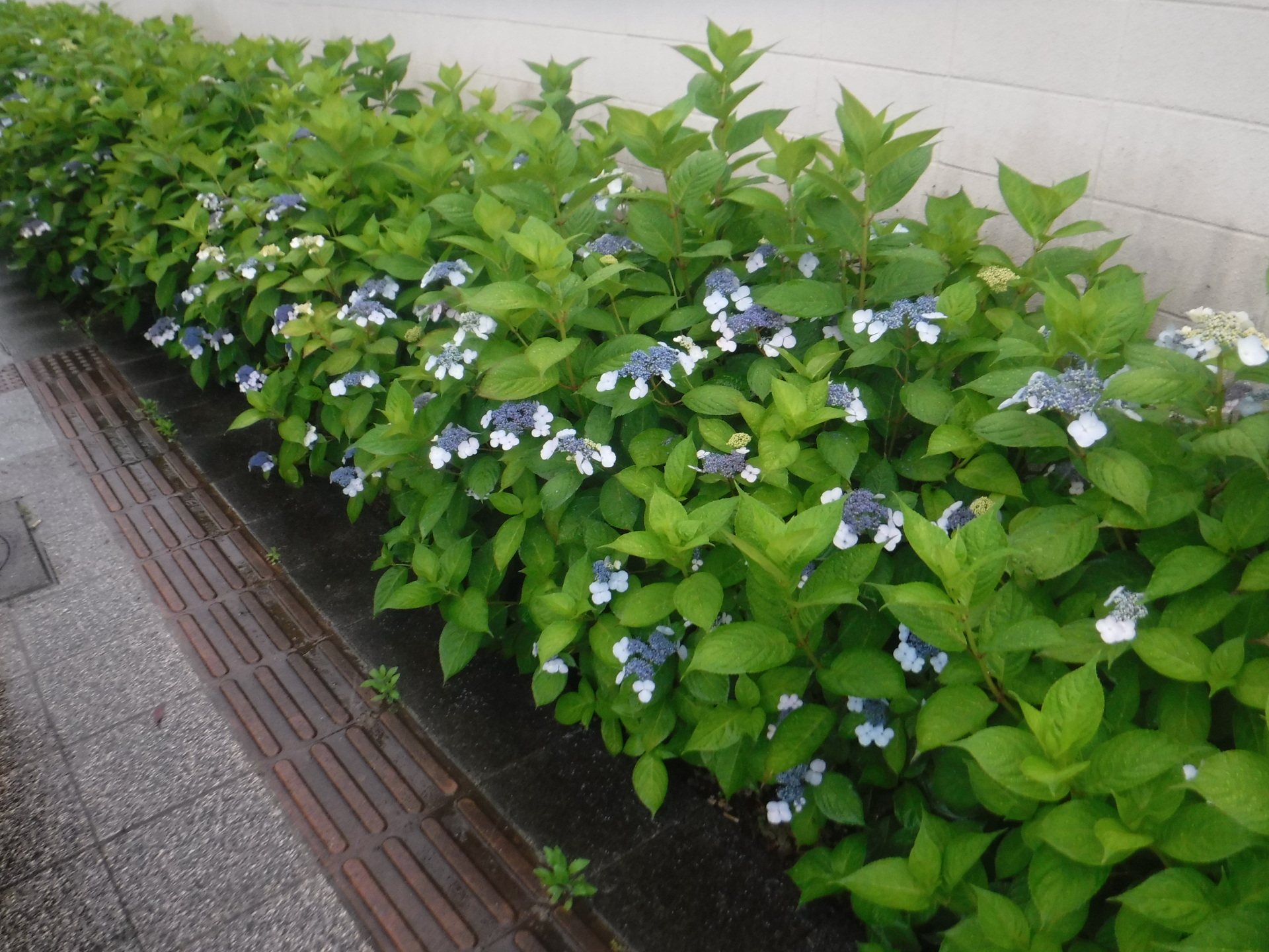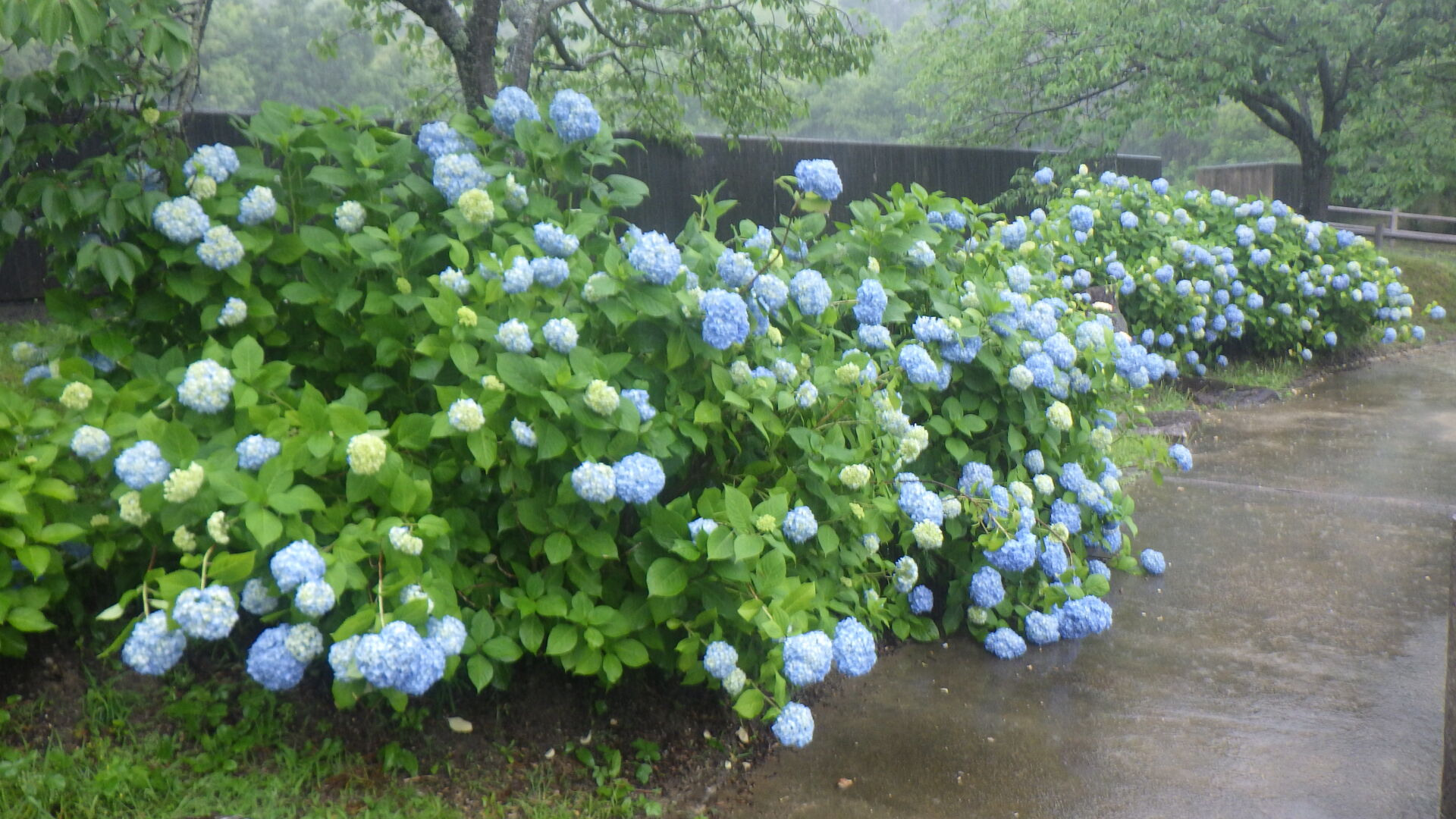 走り梅雨に濡れ木々の緑も深まり 、今年も美しい色合いのアジサイが開花の時を迎えています。アジサイの花は、土壌で花色を変えるという性質があり、ピンクの花はアルカリ性の土壌、青い花は酸性の土壌で咲き、白系のアジサイは土壌によって変化はありません。