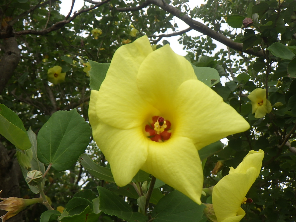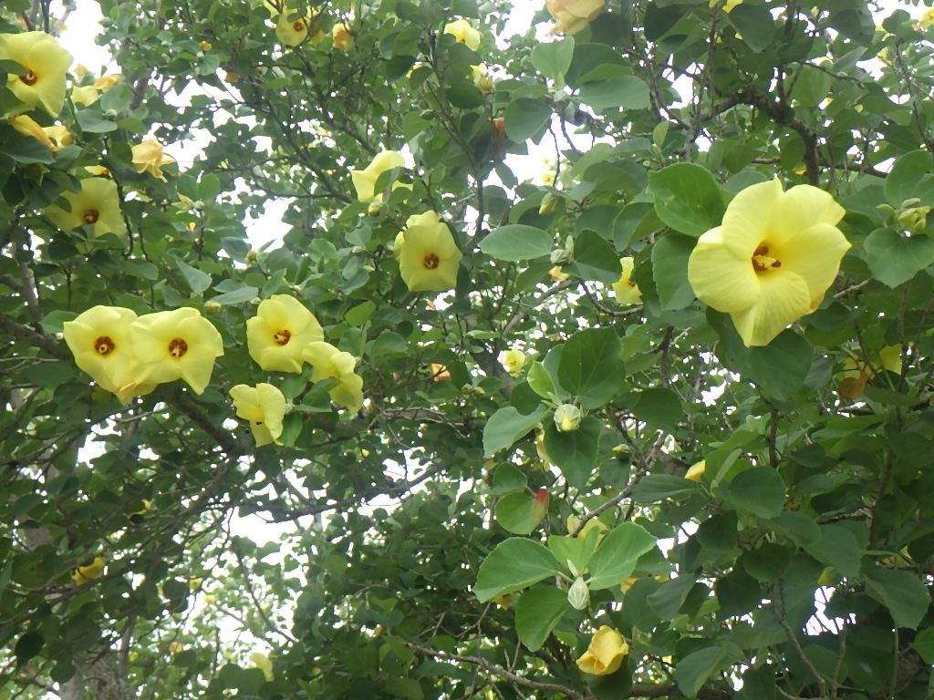 ひまわりの花が咲き始め、いよいよ夏本番という感じで海岸や河口にハマボウの花が次々に咲いています。ハマボウの花は、日当たりが良く風通しの良い環境でハイビスカスのようなレモンイエロー色の花を咲かせます。また、ハマボウの花は朝咲いて夕方に萎む一日花です。