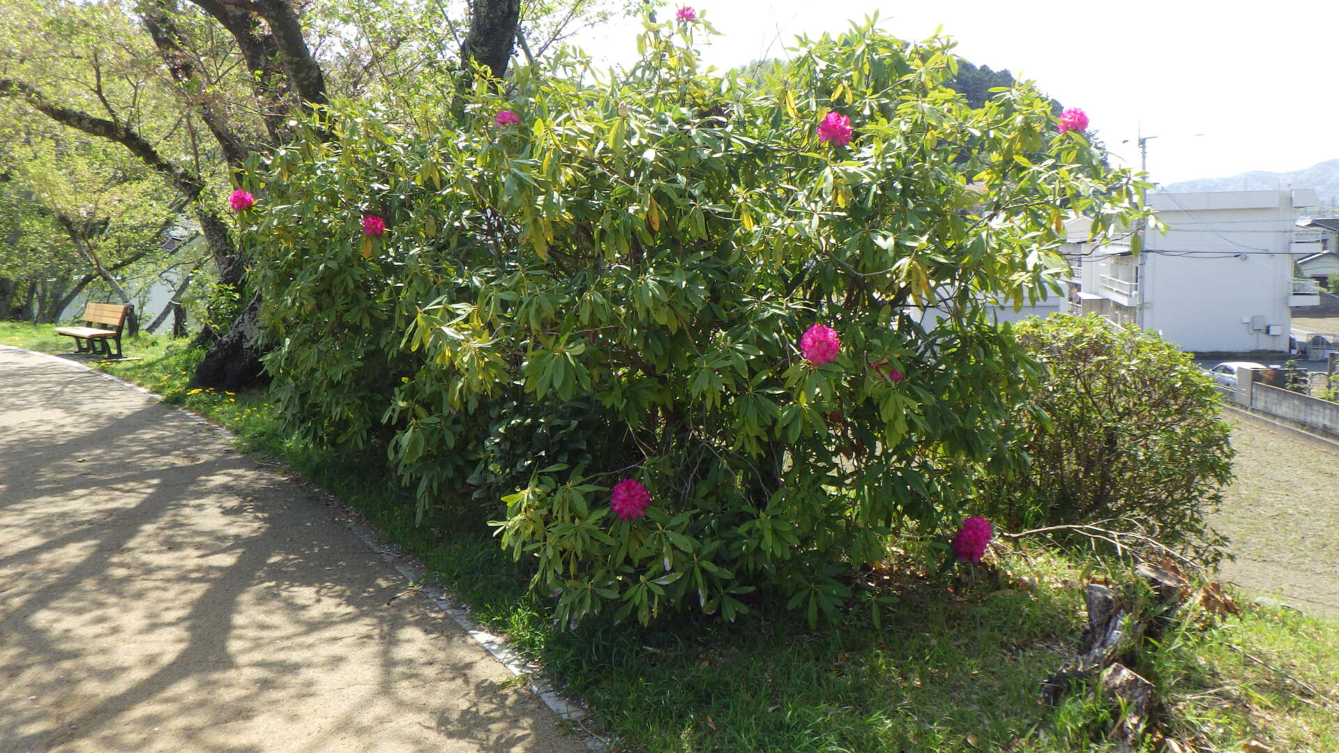 春の穏やかな日差しの中、地蔵院池緑地ではセイヨウシャクナゲの花が見頃を迎えています。