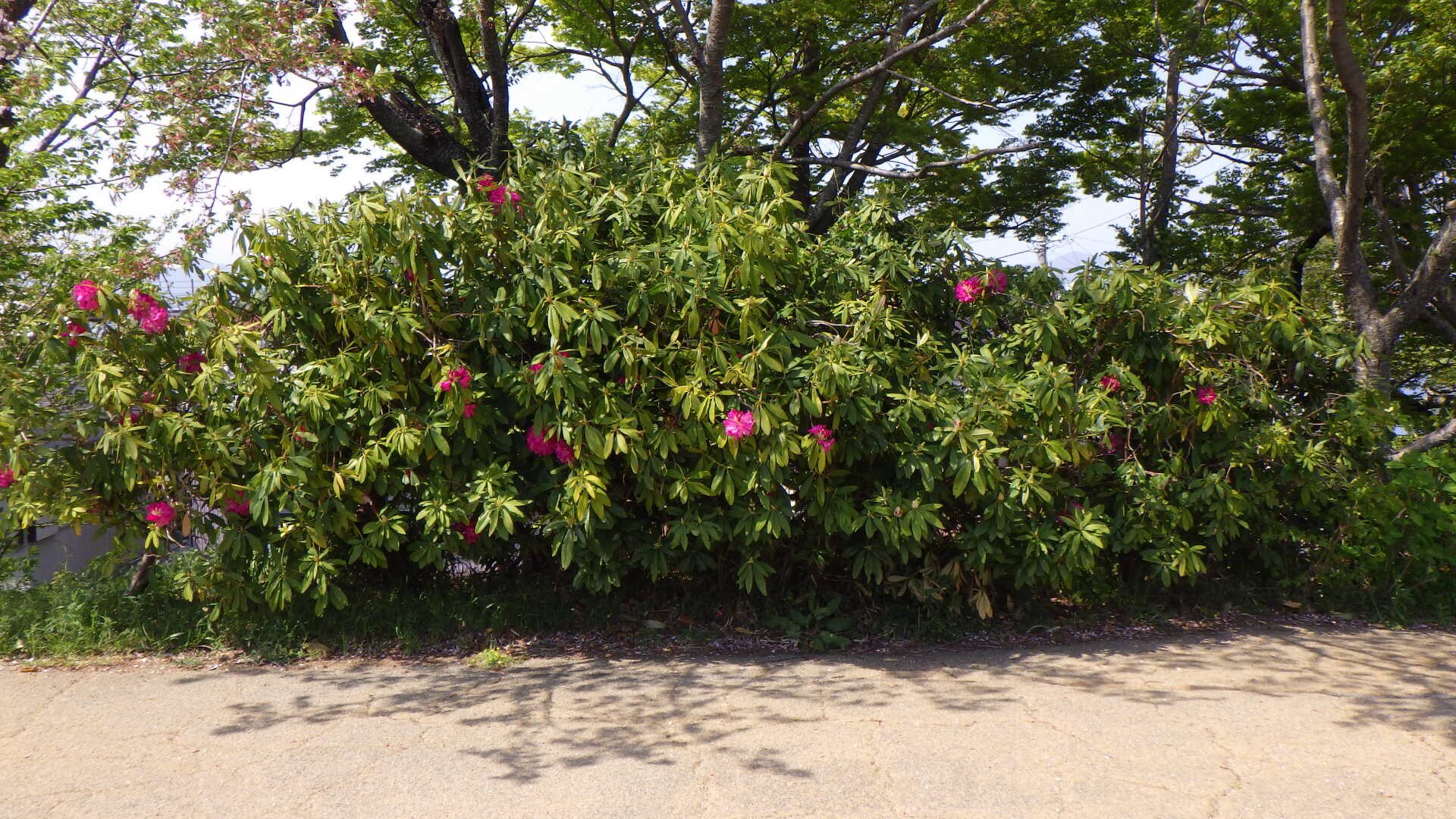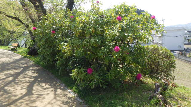 桜の花が散り葉桜の季節となり、多彩にセイヨウシャクナゲの花が彩っています。セイヨウシャクナゲの花は大きく、花色もカラフルで枝先に咲くのが美しく満開の時期は見ごたえがあります。
