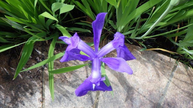 端午の節句を迎え、水辺にカキツバタの花が咲いています。カキツバタの花は、長い花茎の先端に青紫色の花が2〜3個付きます。花は12センチ程で、花被片は6枚あり内花被片は直立し、外花被片3枚が垂れ下がり基部に白〜クリーム色の筋が入ります。
