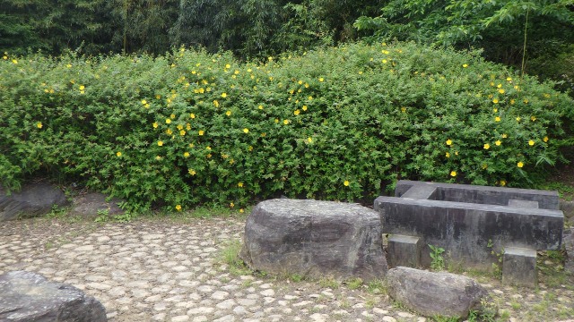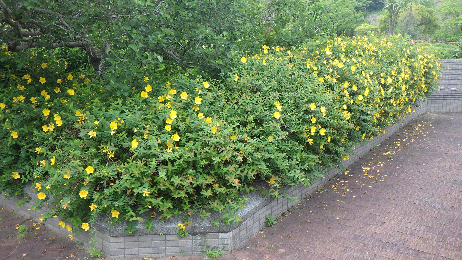衣替えを前に、長袖にしようか夏服にしようか、着るものに困る季節となり、鮮やかな黄色のタイリンキンシバイの花が咲いています。タイリンキンシバイの花は、茎先に数輪の花がつくので開花時はとても華やかで、その花がいっぺんに咲くのではないため開花期間も長いのが特徴です。