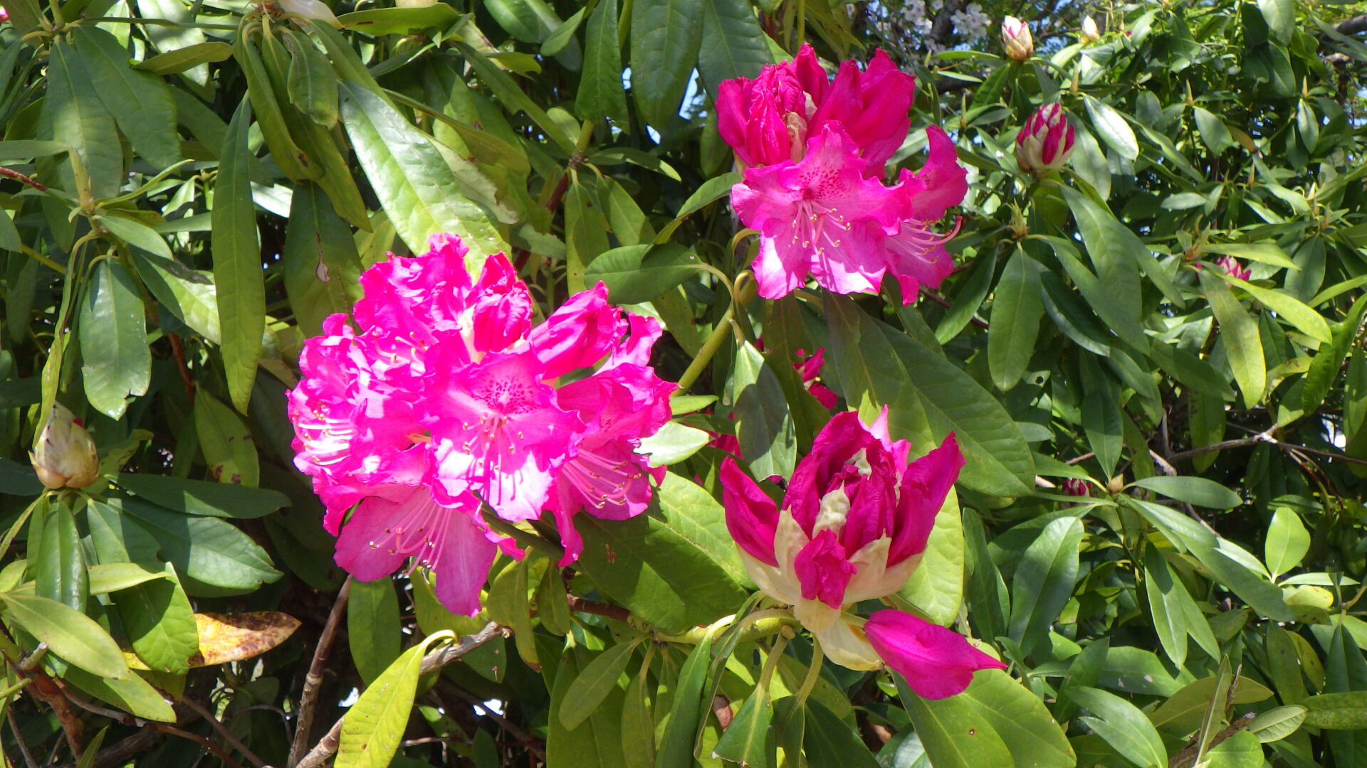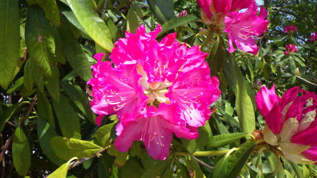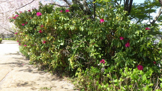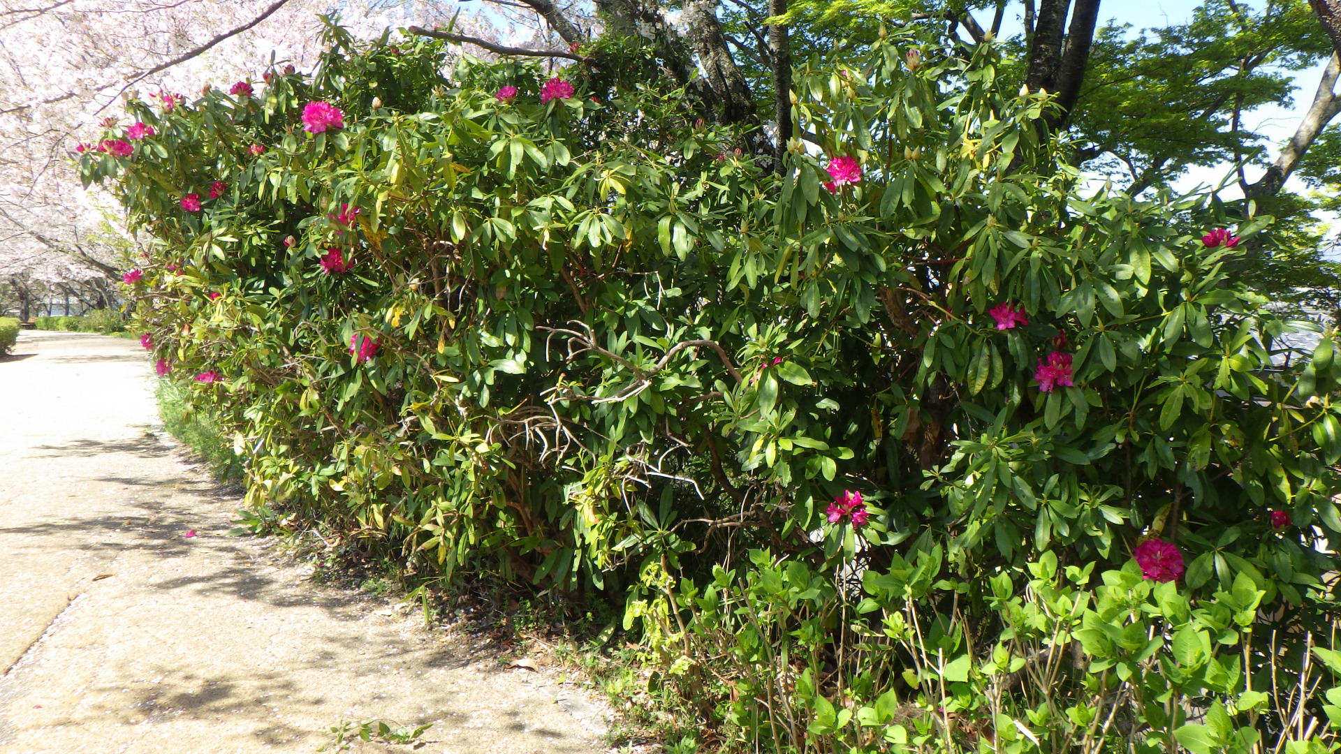 春の花が美しく咲き乱れる季節となり、半日陰で西洋シャクナゲの花が咲いています。西洋シャクナゲの花は、大きく豪華で色の種類も豊富であり、ピンク、白、赤、黄、オレンジ、紫など多彩な色彩を楽しめます。