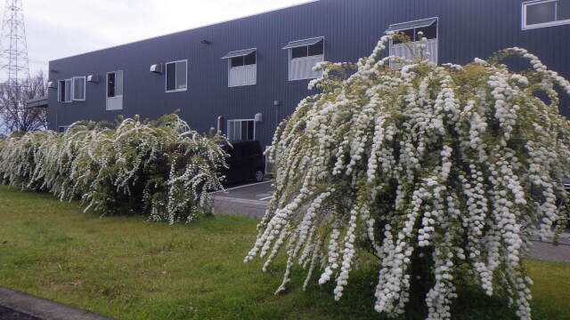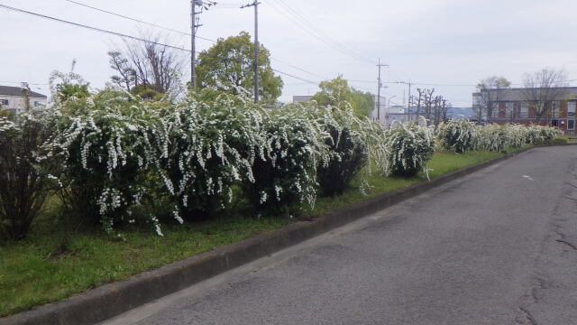 大きなランドセル姿が見られる季節、株元から多くの枝を出しコデマリが小さくて白い花を咲かせています。コデマリの花は、一つひとつの花は大変小さいのですが、丸く集まって咲く花序の姿は手まりのように見えます。また、白い花が枝葉を覆い尽くすように咲き、見応えのあるシーンを作り出します。