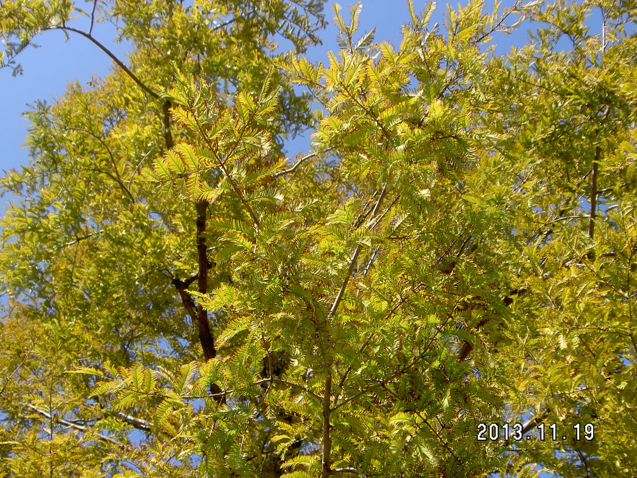 助任緑地では、落葉高木樹で円錐形の樹形をしたメタセコイアが、赤褐色に紅葉しております。メタセコイアは、ラクウショウの樹木と姿形ともよく似ていますが、枝や小さな葉っぱのつきかたをよく見ると、メタセコイアは対生(左右が対で出てくる)、ラクウショウは互生(互い違いに出てくる)という点が異なります。